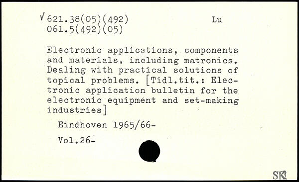 Electronic applications, components and materials, including matronics. Dealing with practical solutions of topical problems. [Tidl.tit.: Electronic application bulletin for the electronic equipment and set-making industries] Eindhoven 1965/66-