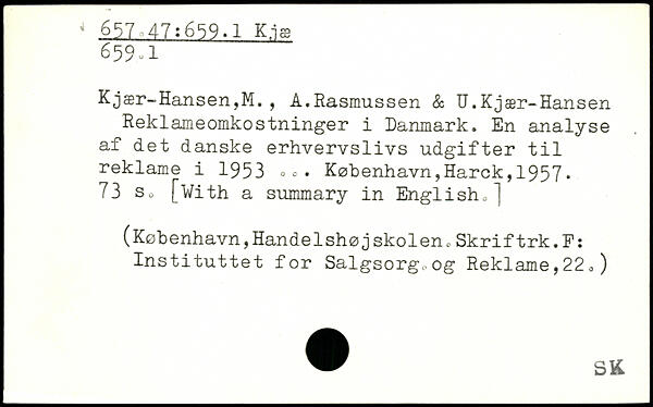 Kjær-Hansen,M., A.Rasmussen & U.Kjær-Hansen Reklameomkostninger i Danmark. En analyse af det danske erhvervslivs udgifter til reklame i 1953 -o.