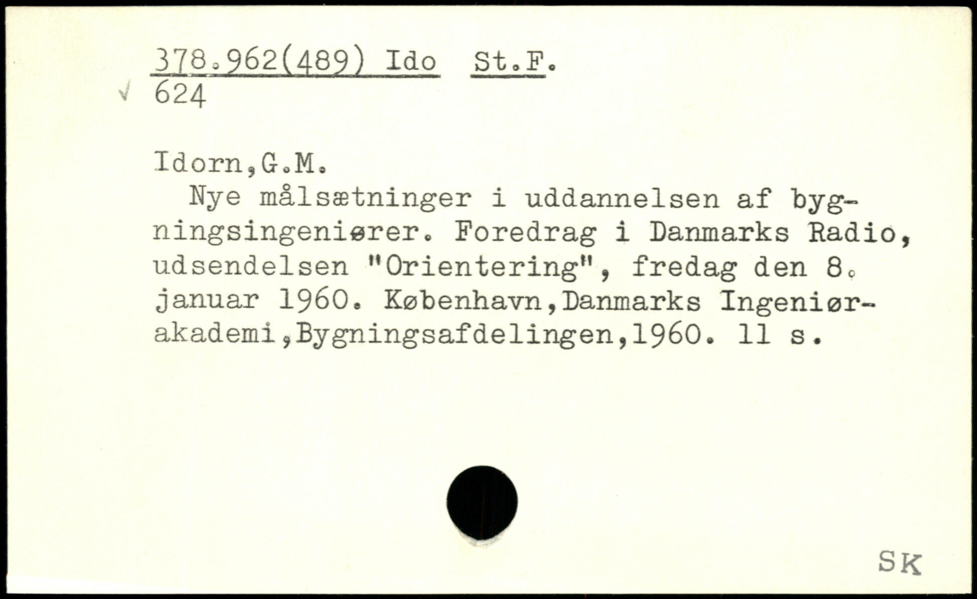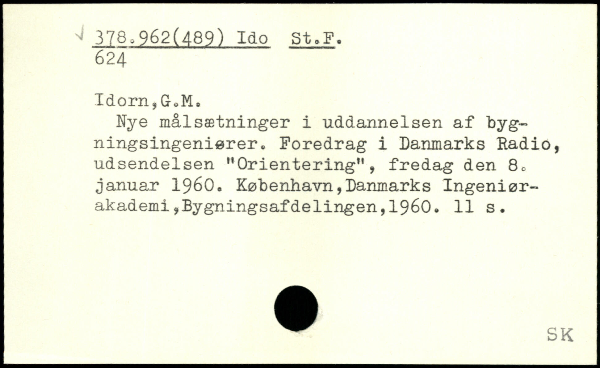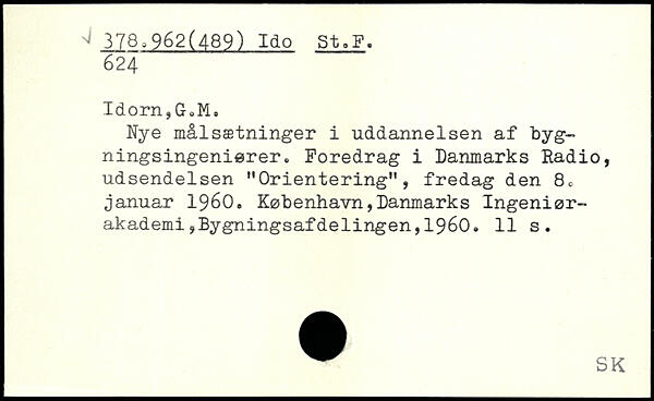 Idorn,G0Ms Nye målsætninger i uddannelsen af bygningsingeniører. Foredrag i Danmarks Radio, udsendelsen '’Orientering”, fredag den 80 januar 1960.