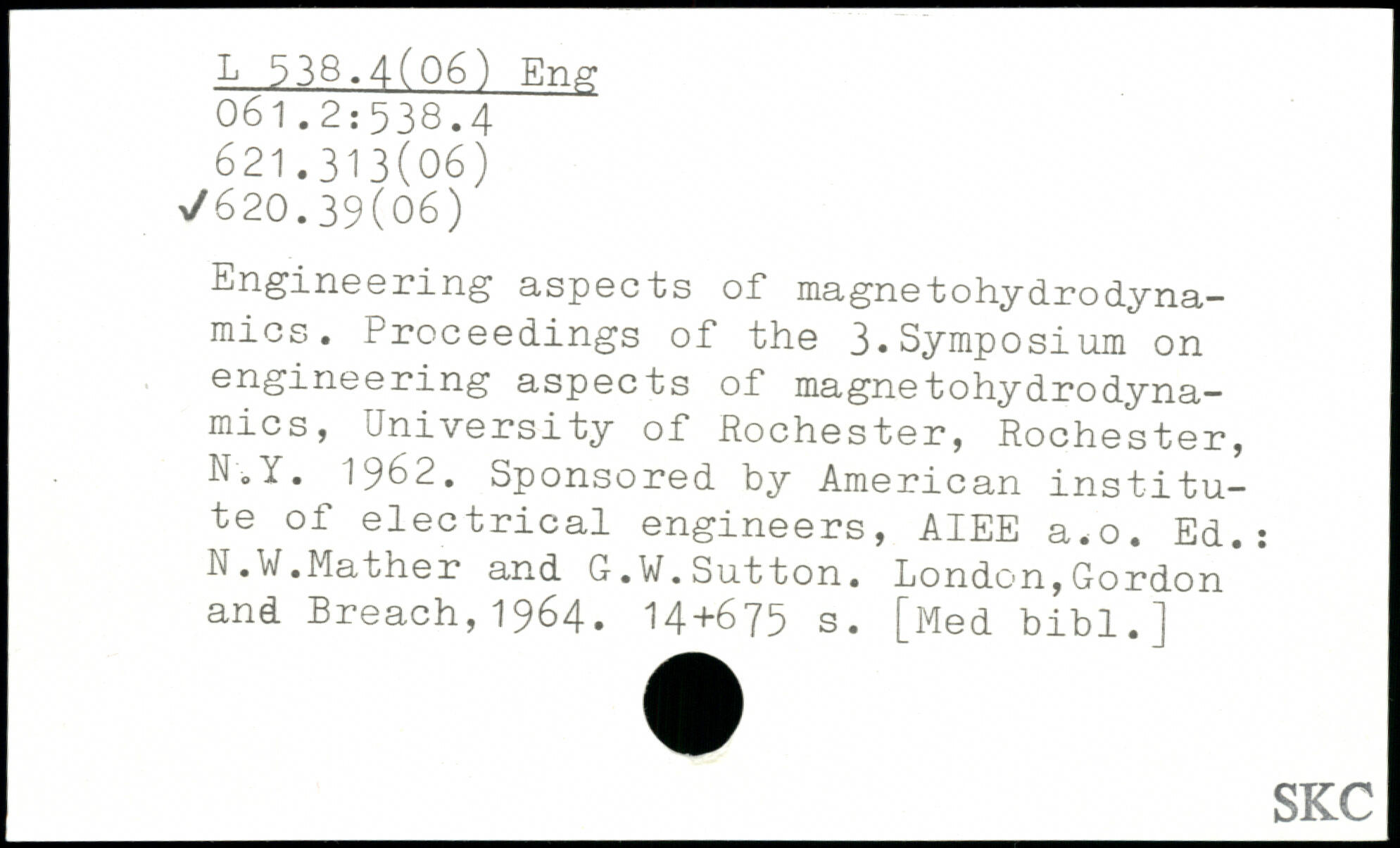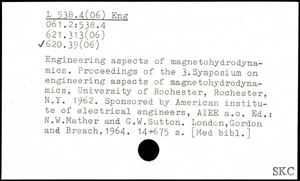 Engineering aspects of magnetohydrodynamics. Proceedings of the 3.Symposium on engineering aspects of magnetohydrodyna-mics, University of Rochester, Rochester, NoY. Ip62. Sponsored by American institu te of electrical engineers, AIEE a.o. Ed.: N.W.Mather and G.W.Sutton.
