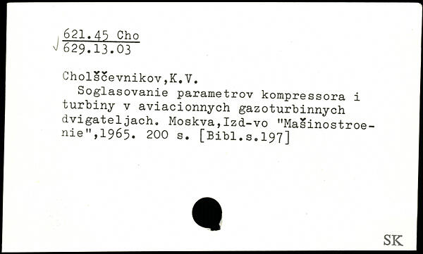 J 629.i3.O3 CholscevnikovjK.V. Soglasovanie parametrov kompressora i turbiny v aviacionnych gazoturbinnych dvigateljach. Moskva,Izd-vo "Masinostroe-nie",1965.