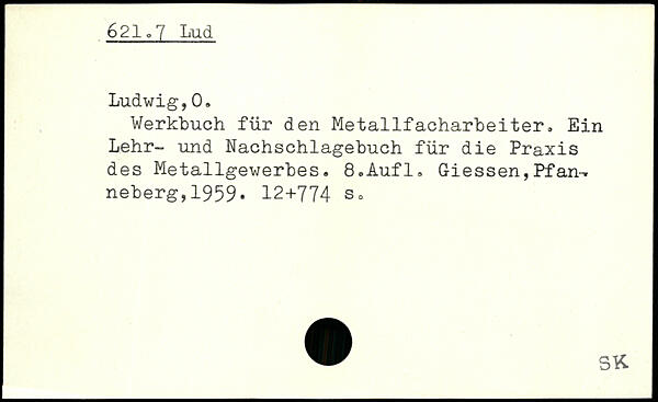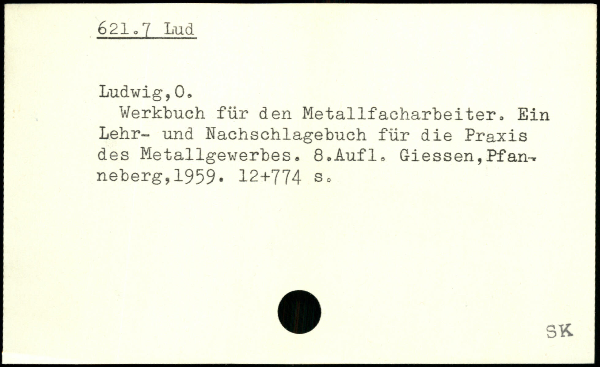 Werkbuch für den Metallfacharbeiter, Ein Lehr- und Nachschlagebuch für die Praxis des Metallgewerbes. Ö.Aufl. Giessen, Pf an-. neberg,1959.