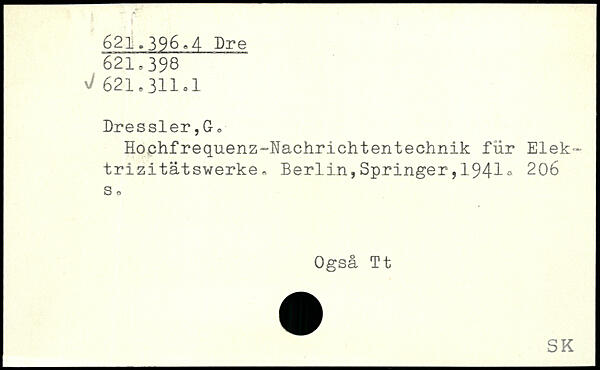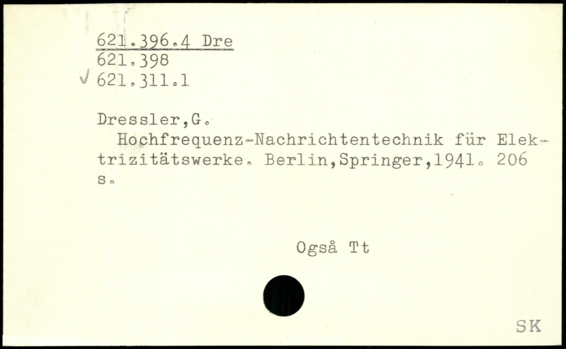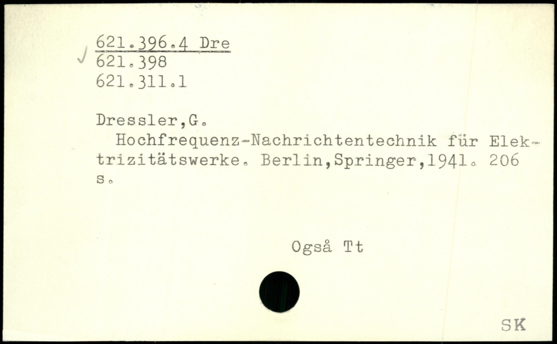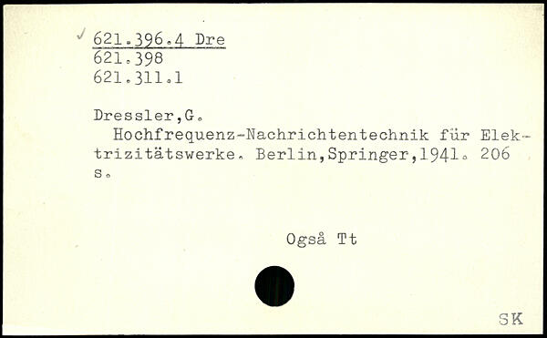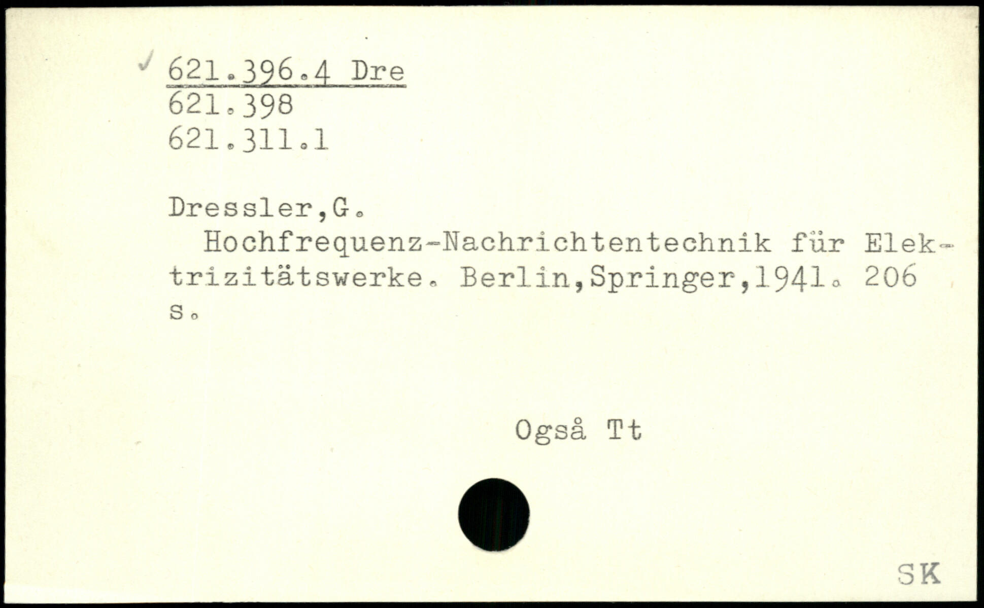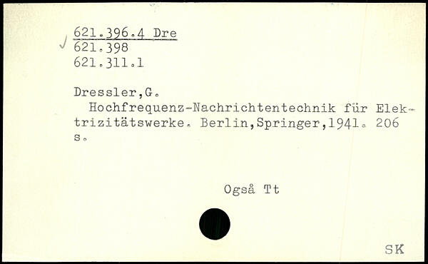 Hochfrequenz-Nachrichtentechnik für Elektrizitätswerke, Berlin,Springer,1941, 206 S o Også Tt