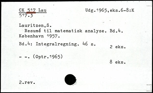 CK Lau Udg.1965,eks.6-8:K 517-3 Lauritzen,S. Resumé til matematisk analyse.