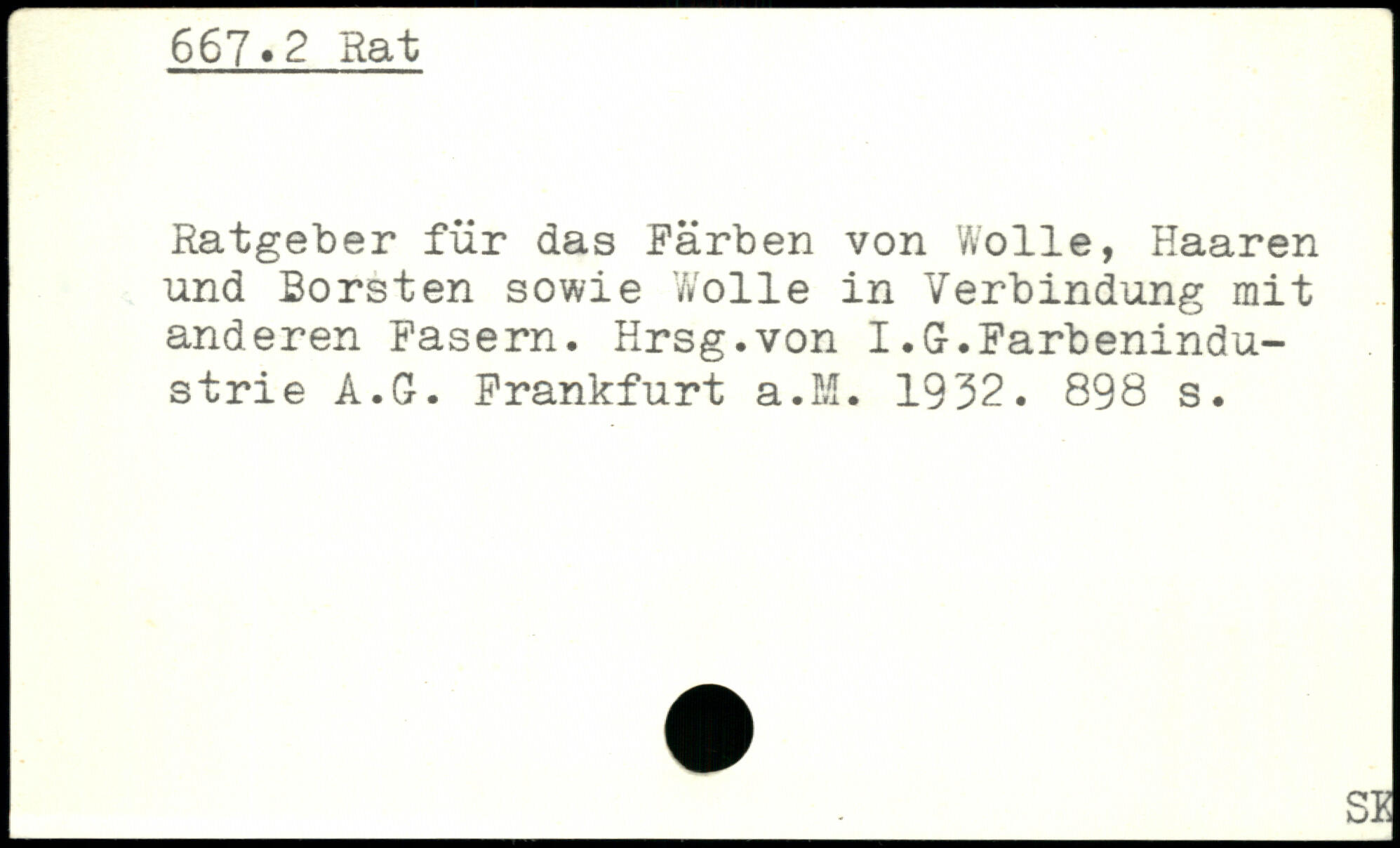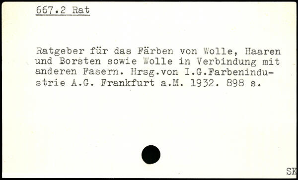 Ratgeber für das Färben von Wolle, Haaren und Borsten sowie Wolle in Verbindung mit anderen Fasern. Hrsg.von I.G.Farbenindustrie A.G. Frankfurt a.M. 1932.