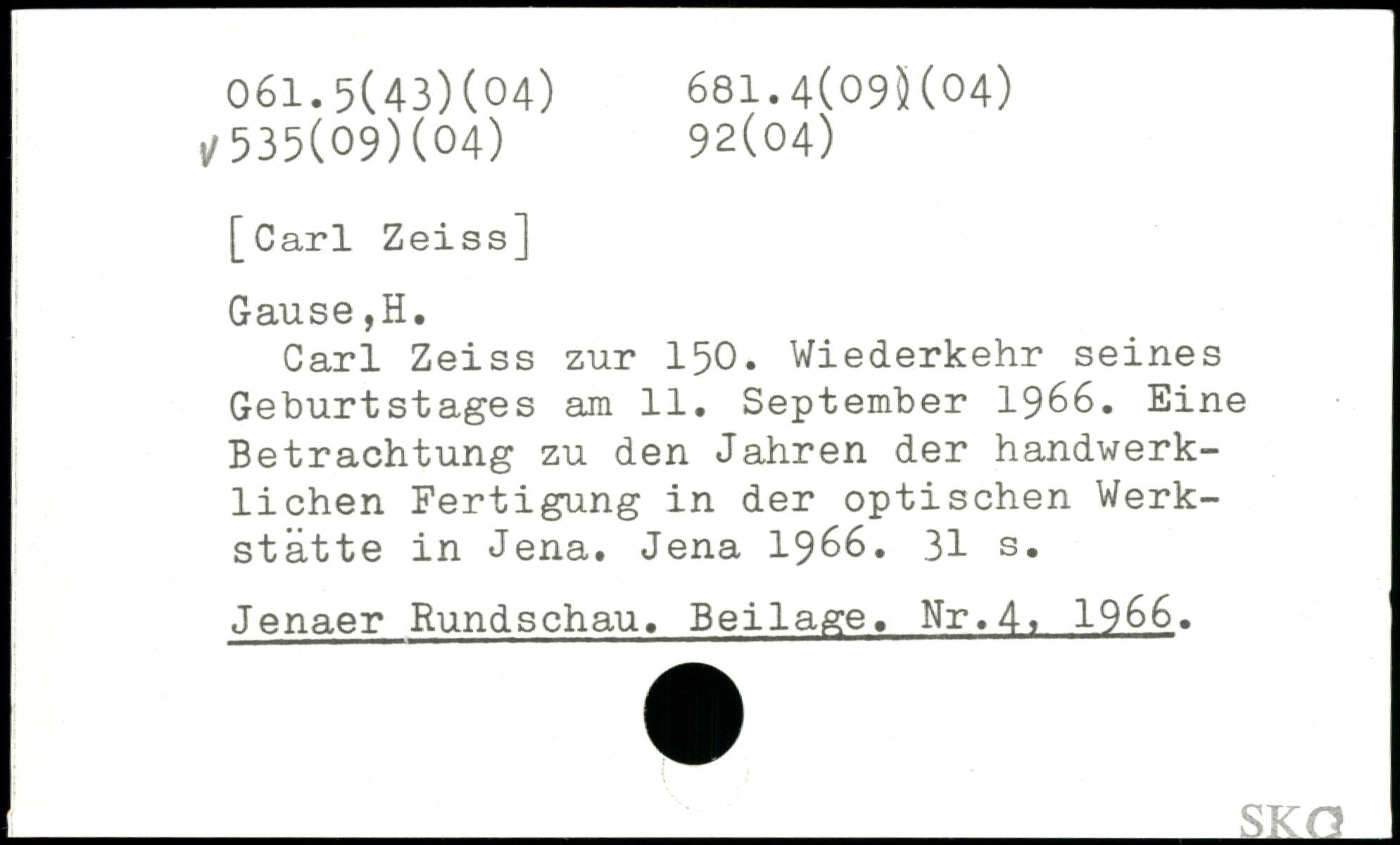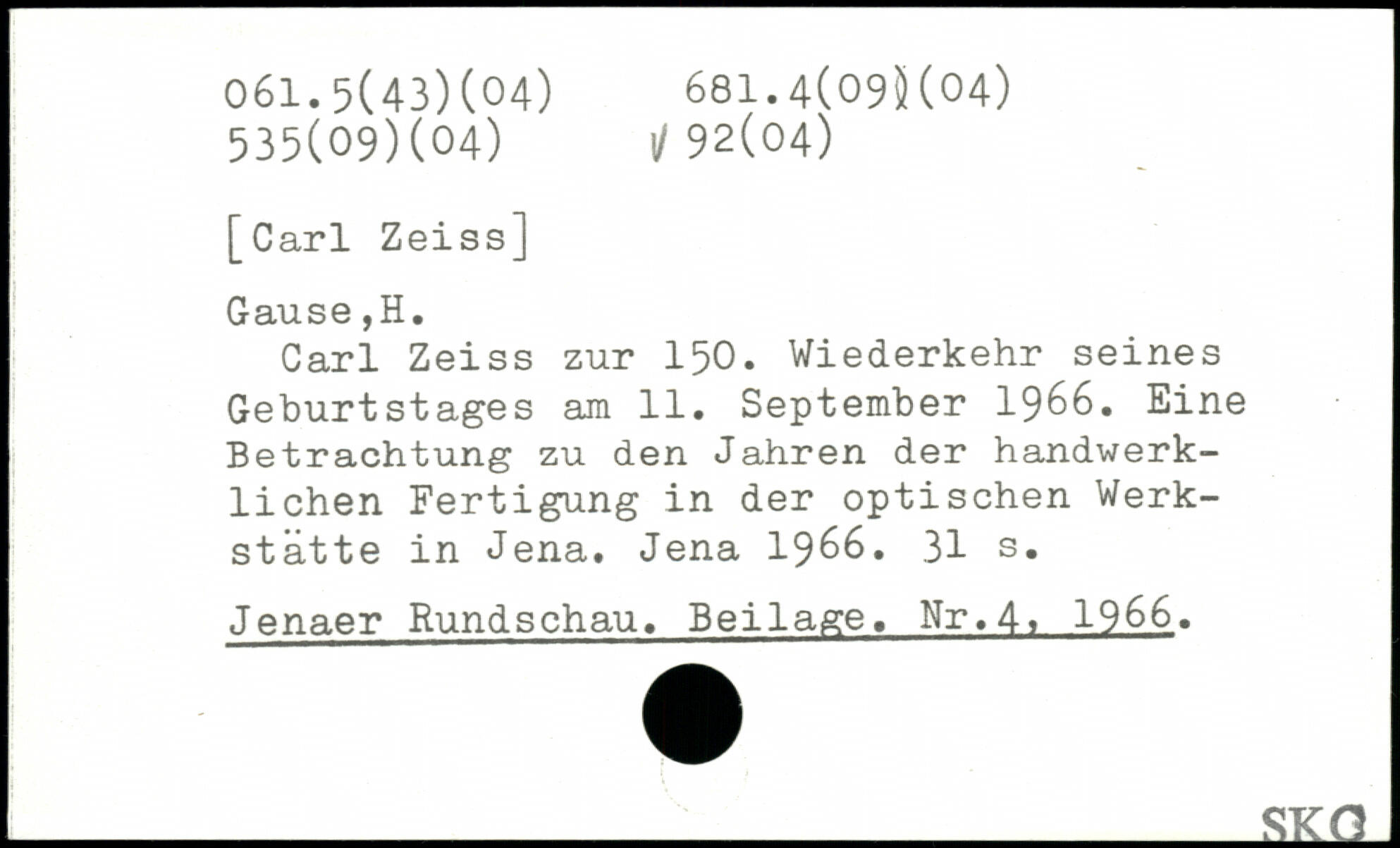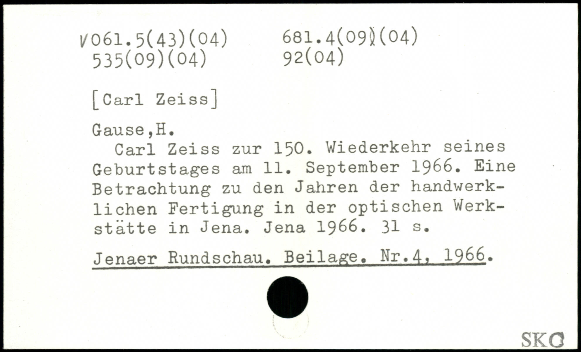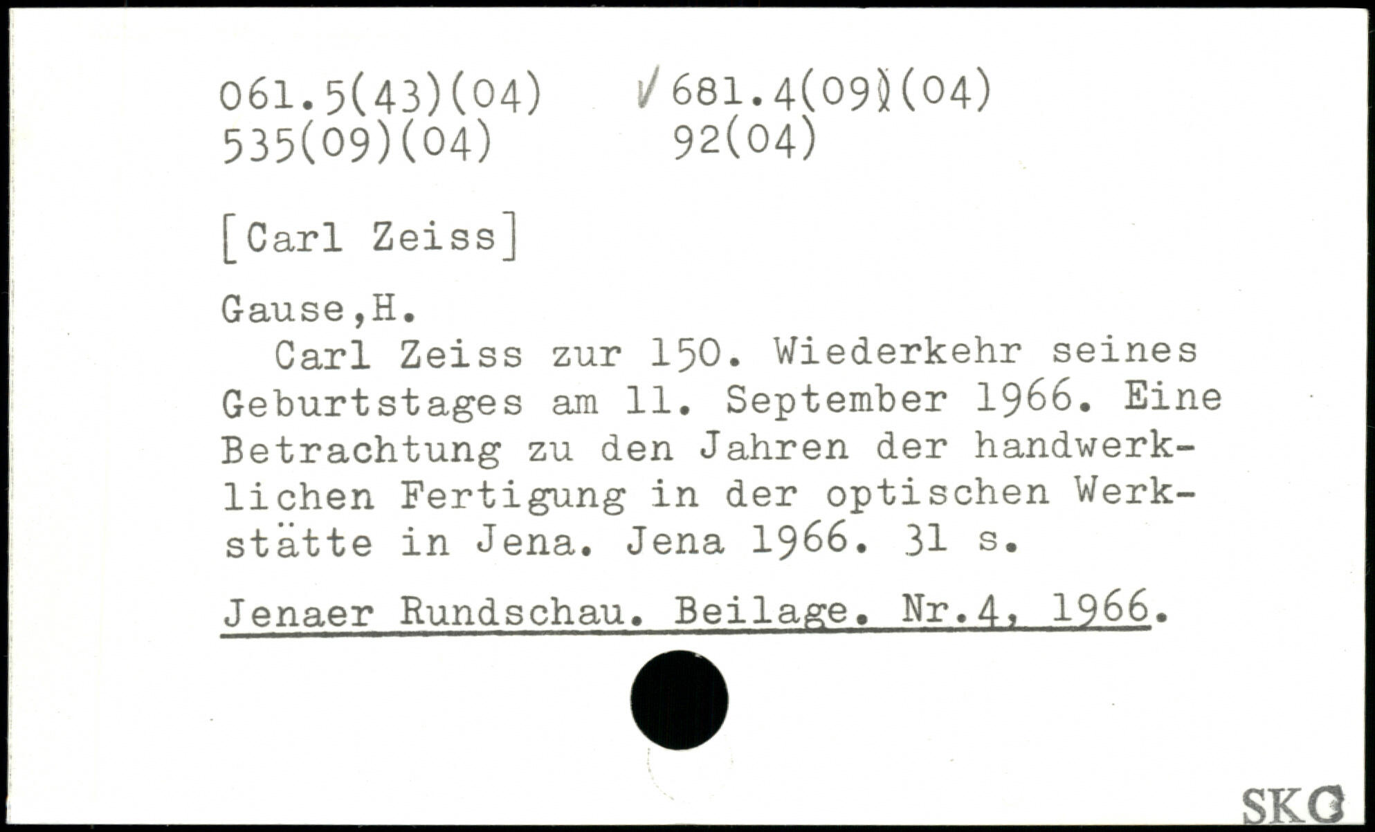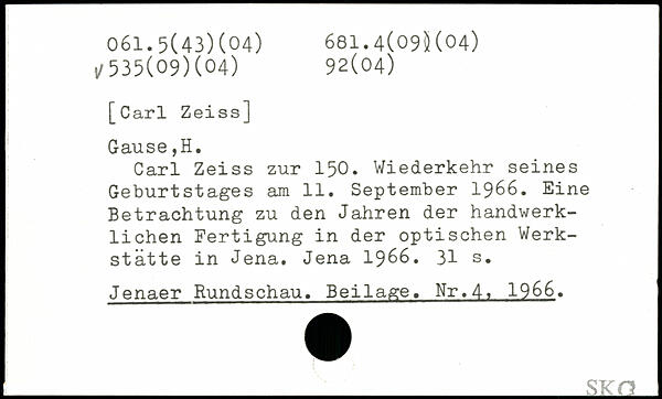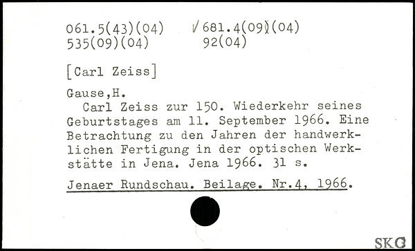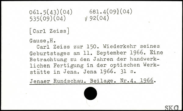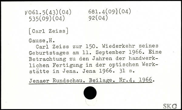 Carl Zeiss zur 150. Wiederkehr seines Geburtstages am 11. September 1966. Eine Betrachtung zu den Jahren der handwerklichen Fertigung in der optischen Werkstätte in Jena. Jena 1966.