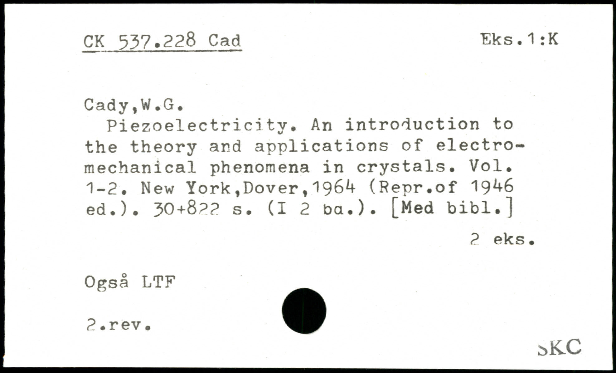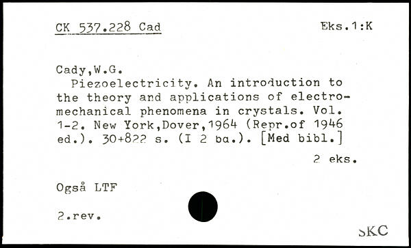 Piezoelectricity. An introduction to the theory and applications of electromechanical phenomena in crystals. Vol. 1-2. New York ,Dover 1196^ (Repr.of 19.+