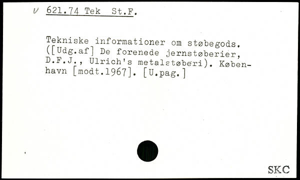 Tekniske informationer om støbegods. ([Udg.af] De forenede jernstøberier, D.F.J., Ulrich's metalstøberi). København [modt.1967]. [U.pag.]