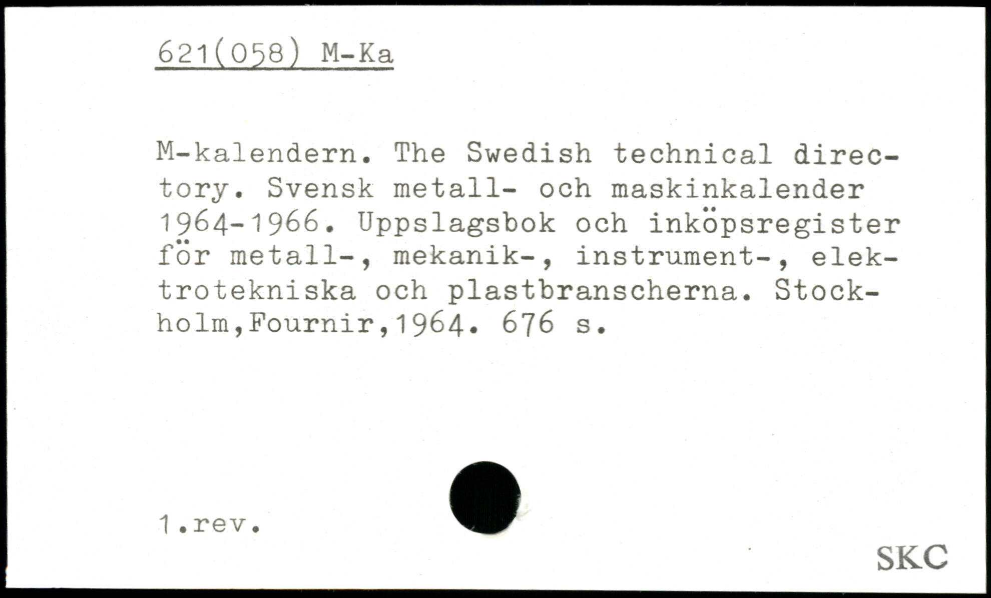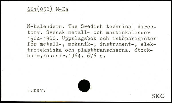M-kalendern. The Swedish technical direc-tory. Svensk metall- och maskinkalender 1964-1966. Uppslagsbok och inköpsregister för metall-, mekanik-, instrument-, elek-trotekniska och plastbranscherna. Stockholm,Fournir, 1 964