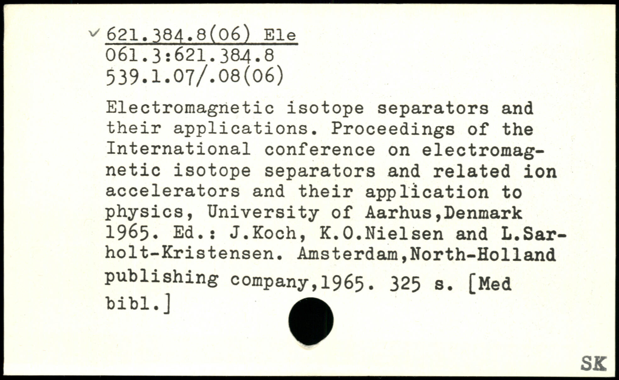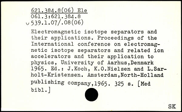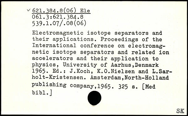 Electromagnetic isotope separators and their applications. Proceedings of the International conference on electromagnetic isotope separators and related ion accelerators and their application to physics, University of Aarhus,Denmark 1965. Ed.: J.Koch, K.O.Nielsen and L.Sar-holt-Kristensen.