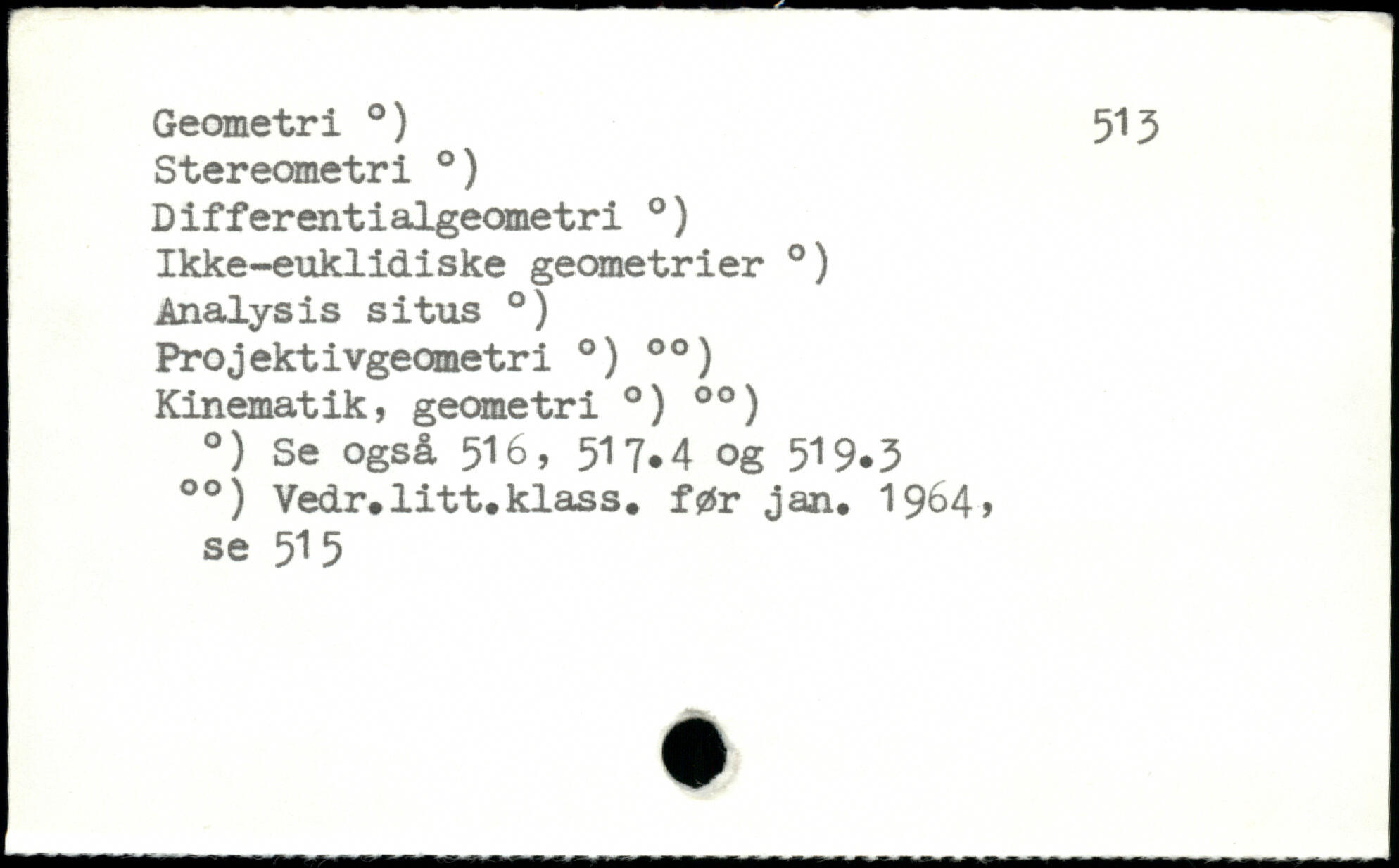 Differentialgeometri .) Ikke-euklidiske geometrier .) Analysis situs .) Projektivgeometri .) 00) Kinematik, geometri .) 00) .) Se også 516, 517.4 og 519.3 00) Vedr,litt,klass, før jan, 1964, se 515