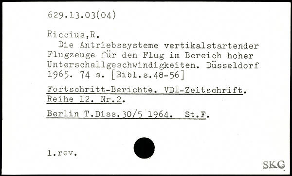 Die AntriebsSysteme vertikalstartender Flugzeuge für den Flug im Bereich hoher Unterschallgeschwindigkeiten. Düsseldorf 1965.