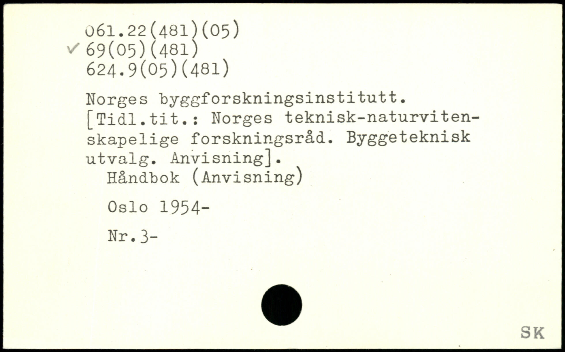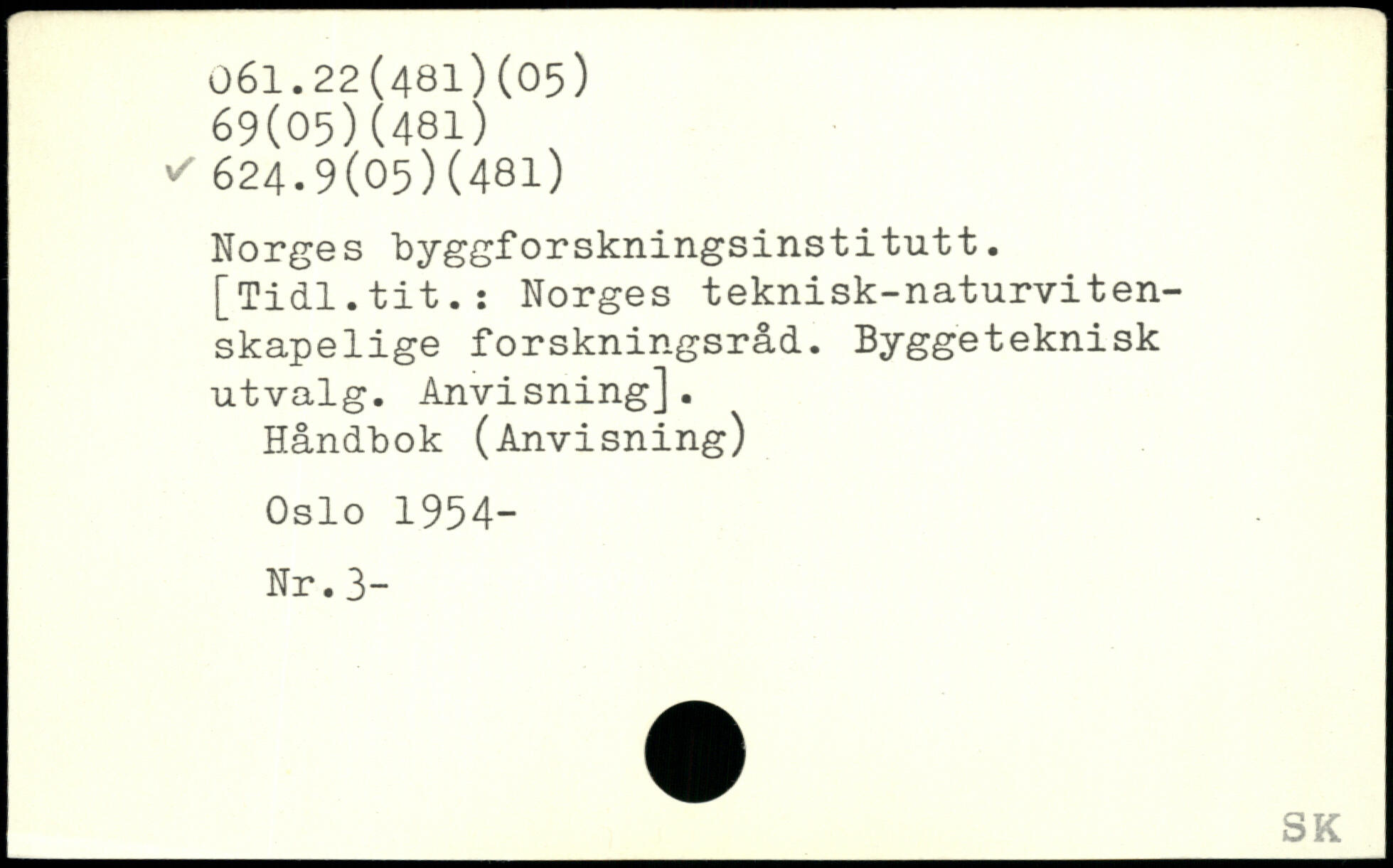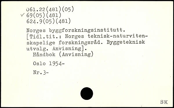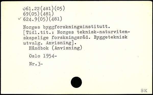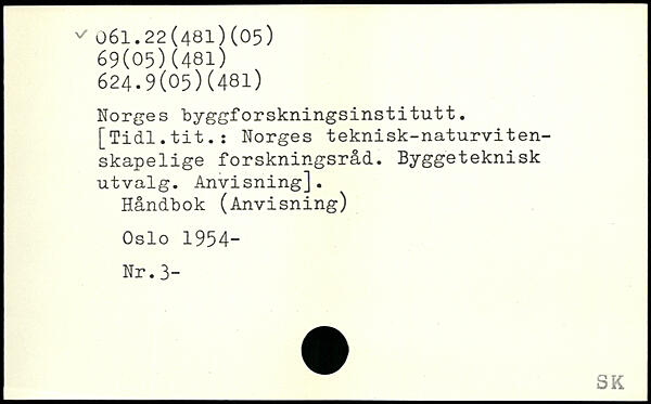 Norges byggforskningsinstitutt. [Tidl.tit.: Norges teknisk-naturviten-skapelige forskningsråd. Byggeteknisk utvalg. Anvisning]. Håndbok (Anvisning) Oslo 1954- Nr.3-