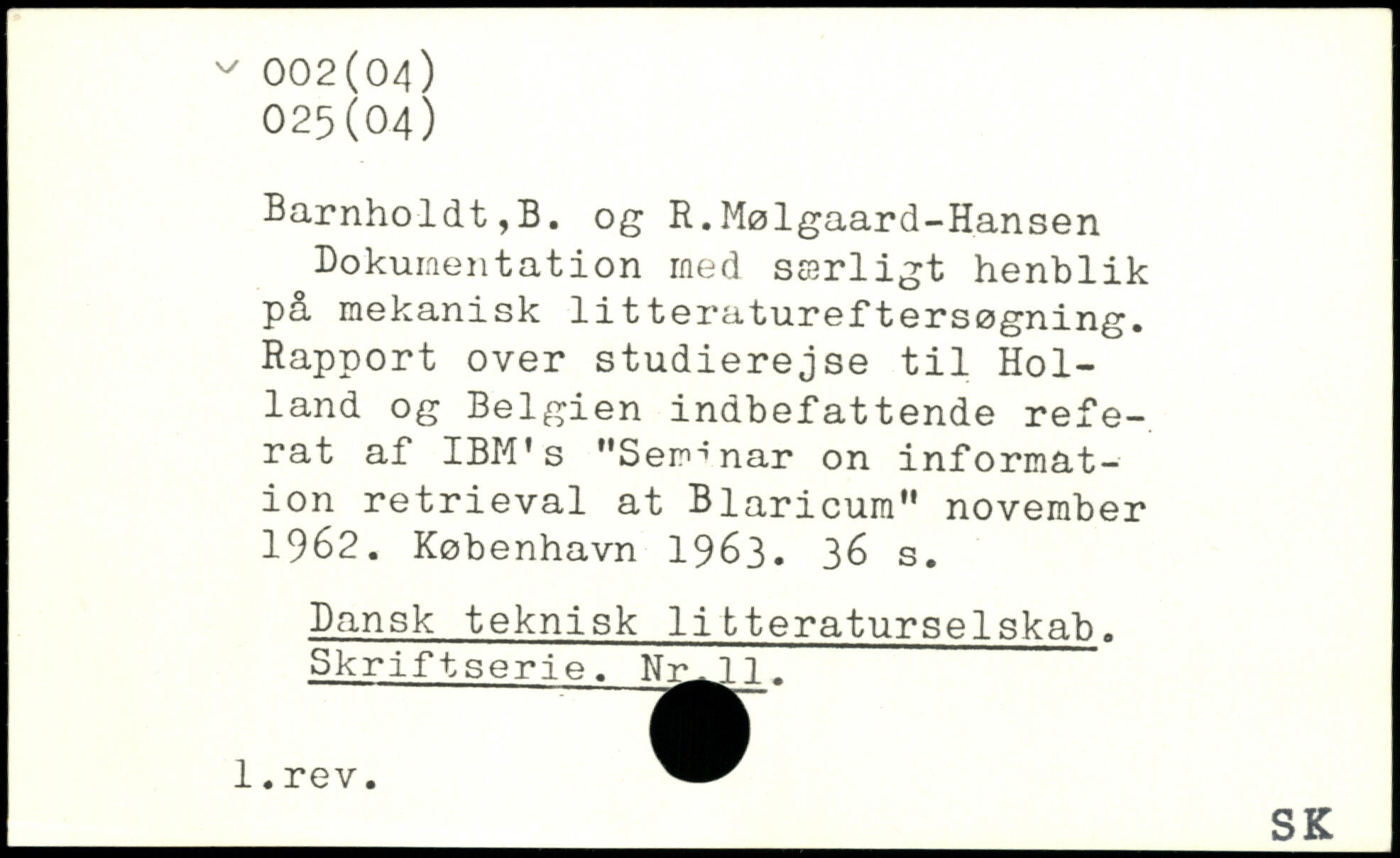 Barnholdt,B. og R.Mølgaard-Hansen Dokumentation med særligt henblik på mekanisk litteratureftersøgning. Rapport over studierejse til Holland og Belgien indbefattende referat af IBM’s "Sepinar on information retrieval at Blaricum" november 1962.