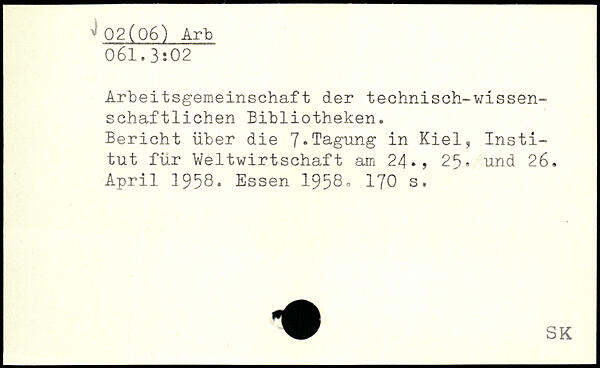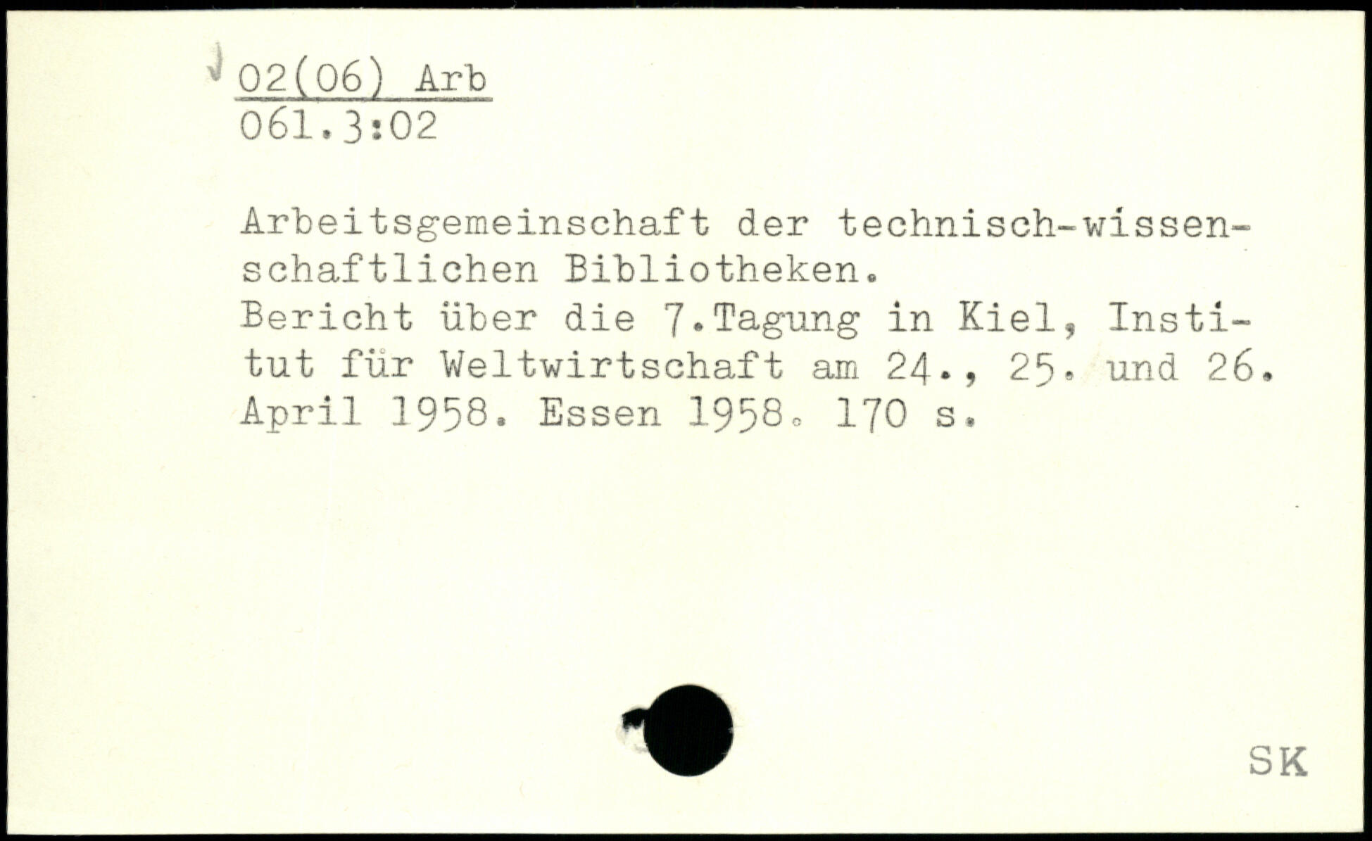 Arbeitsgemeinschaft der technisch--wissenschaftlichen Bibliotheken. Bericht über die 7,Tagung in Kiel, Institut für Weltwirtschaft am 24,, 25, und 26. April 1958.