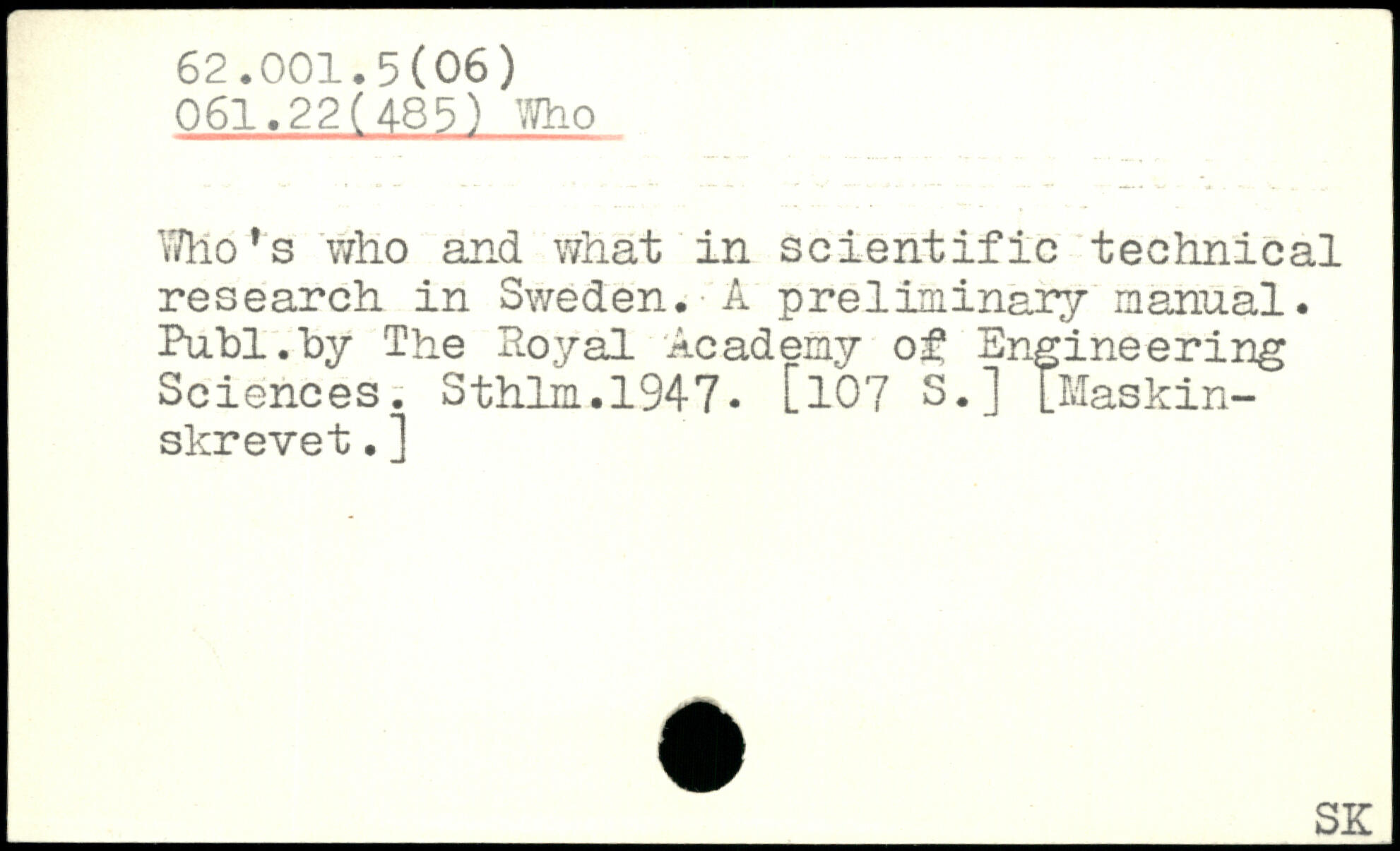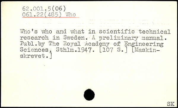 Whors who and what in scientific technical research in Sweden. A preliminary manual. Pu.bl.by The Royal Academy of Engineering Sciences. Sthlm.1947. [l
