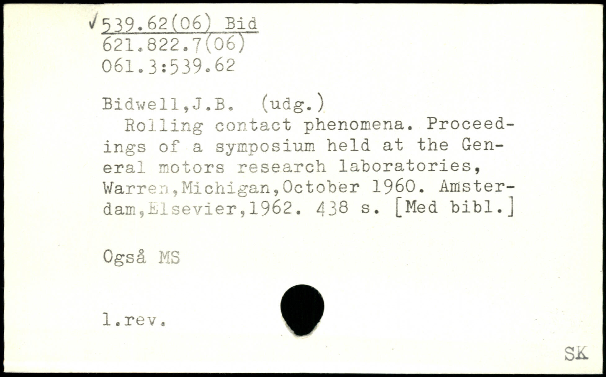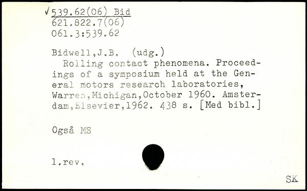 Rolling contact phenomena. Proceedings of a symposium held at the General motors research laboratories, Warren,Michigan,October 1960.