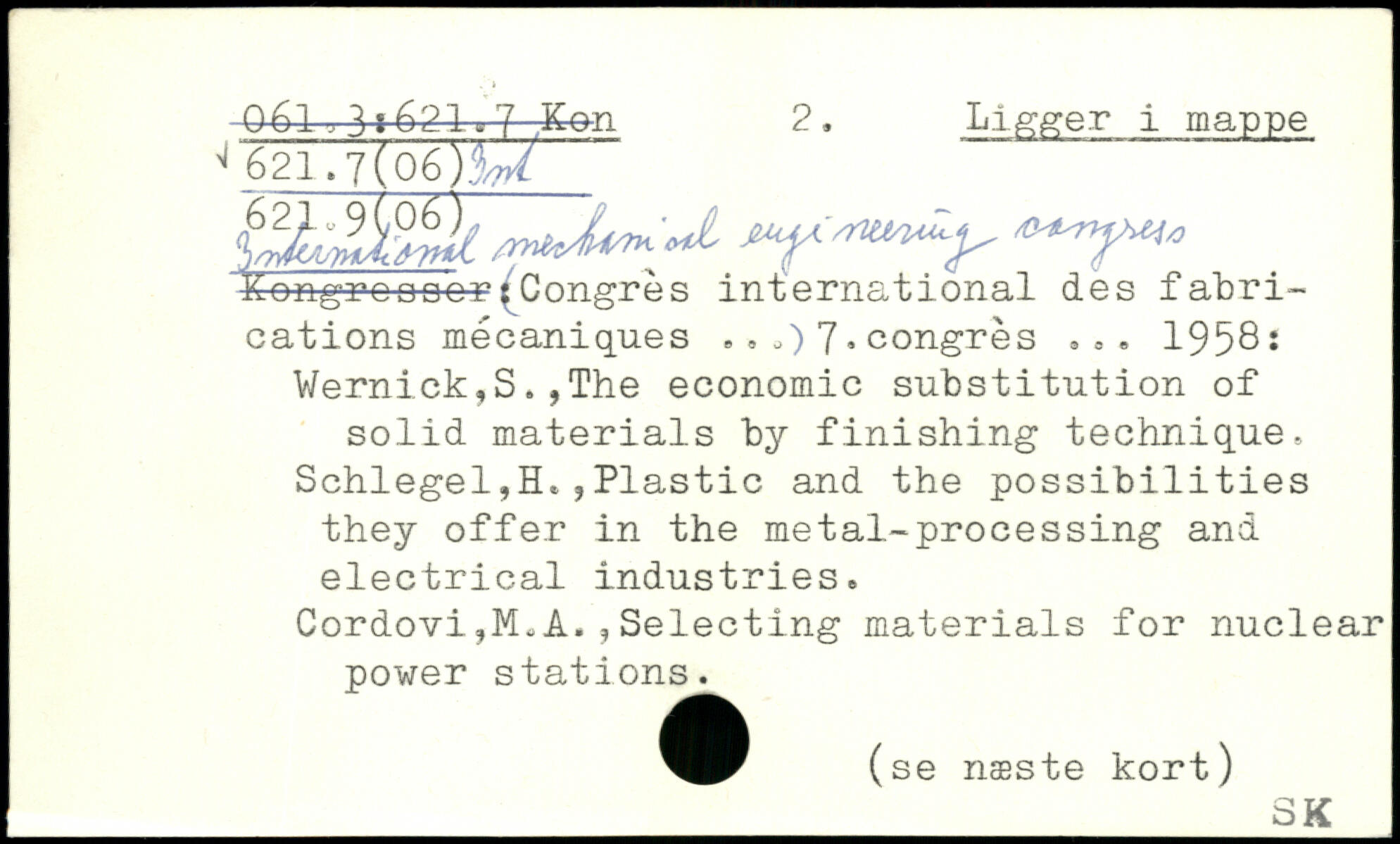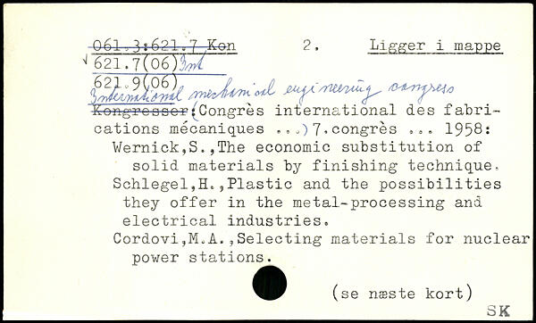 Kongroooor^Congrès international des fabrications mécaniques .. ,)7 , congrès ... 1958: Wernick,S. ,The economic substitution of solid materials by finishing technique, SchlegeljH,,Plastic and the possibilities they offer in the metal-processing and electrical industries. CordoviA.,Selecting materials for nuclear power stations.