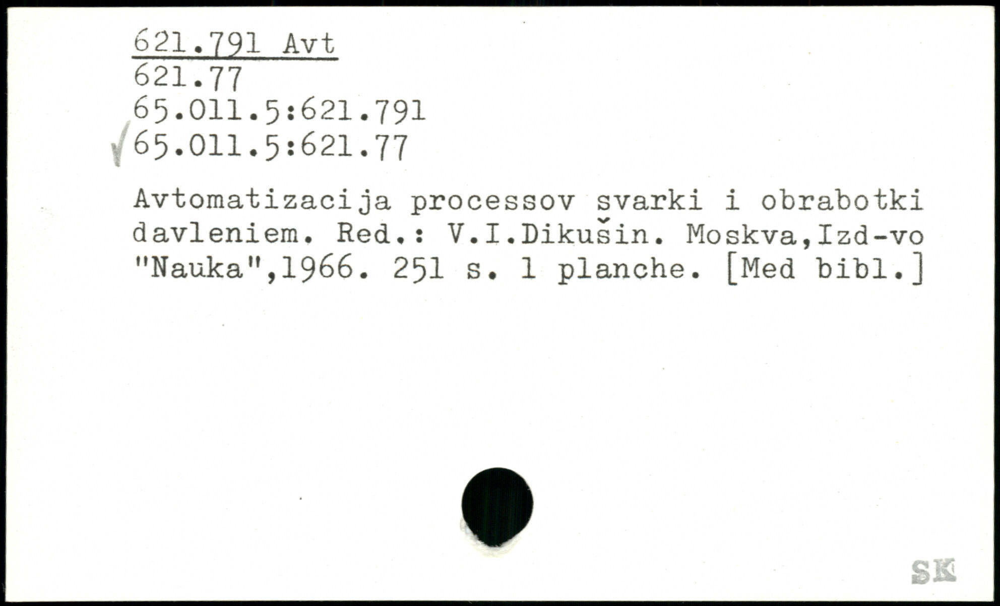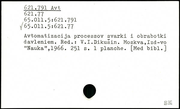 Avtomatizacija processov svarki i obrabotki davleniem. Red,: V.I.Dikusin. Moskva,Izd-vo "Nauka",1966. 25I s. 1 planche. [Med bibl.]