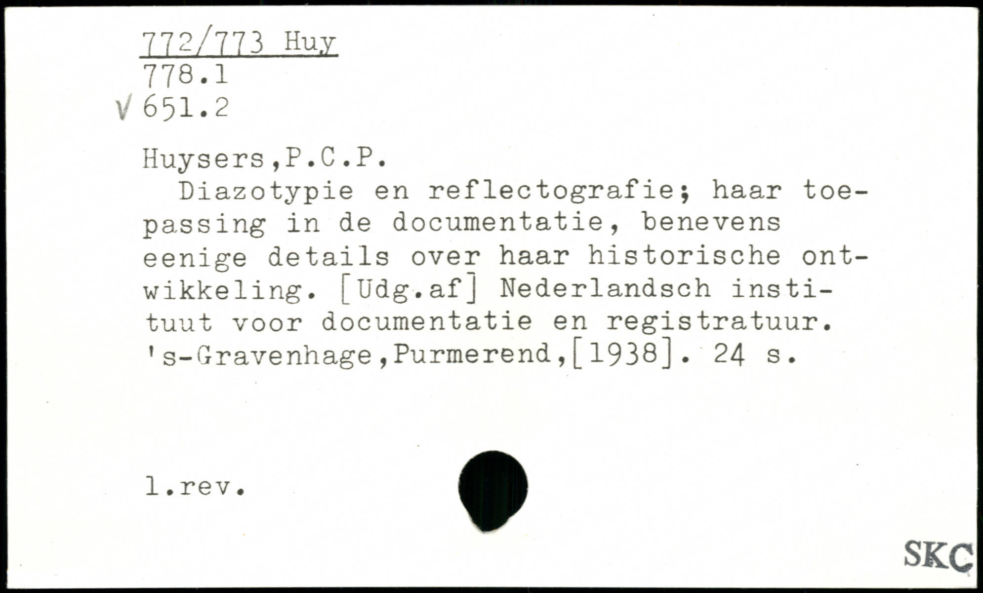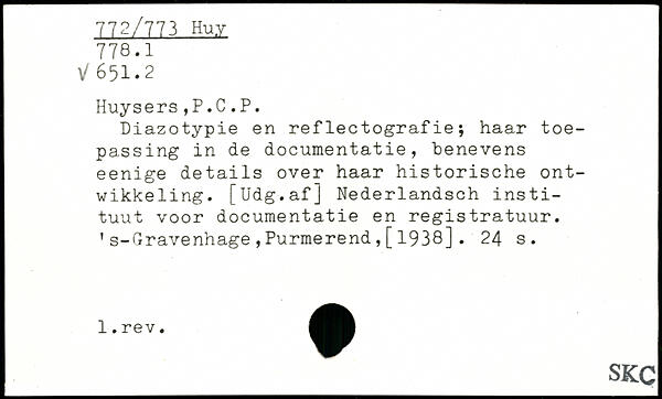 Diazotypie en reflectografie; haar toepassing in de documentatie, benevens eenige details over haar historische ont-wikkeling. [Udg.af] Nederlandsch insti-tuut voor documentatie en registratuur. 's-Gravenhage,Purmerend, [ 1938].