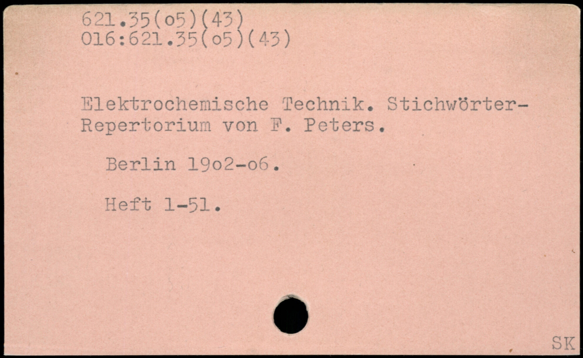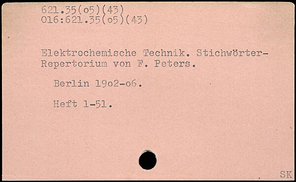 Elektrochemische Technik. Stichwörter-Repertorium von F. Peters. Berlin 19o2-o6. Heft 1-51. _ SK
