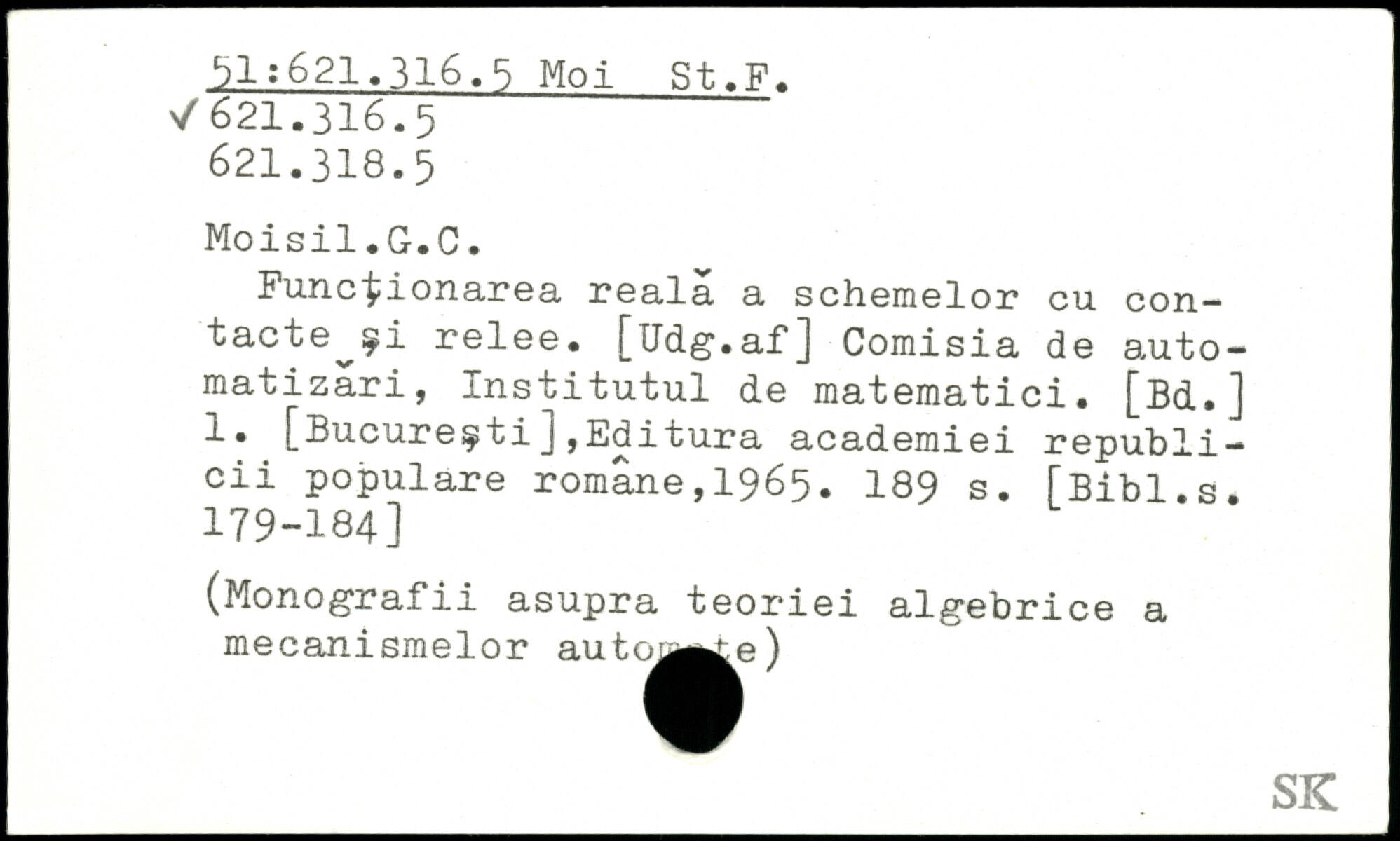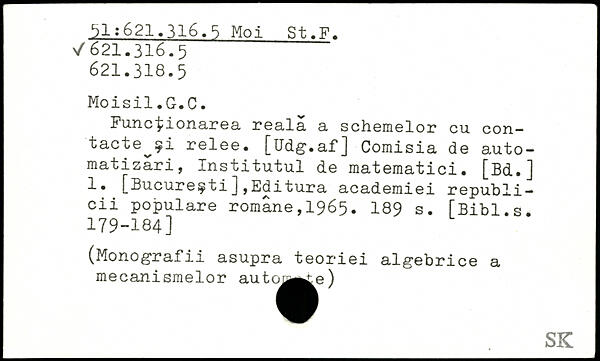Func^ionarea reala a schemelor eu contacterai relee. [Udg.af] Comisia de auto-matizari, Institutul de matematici. [Bd.] 1. [Bucureçti],Editura academiei republi-cii populäre romane,1965.