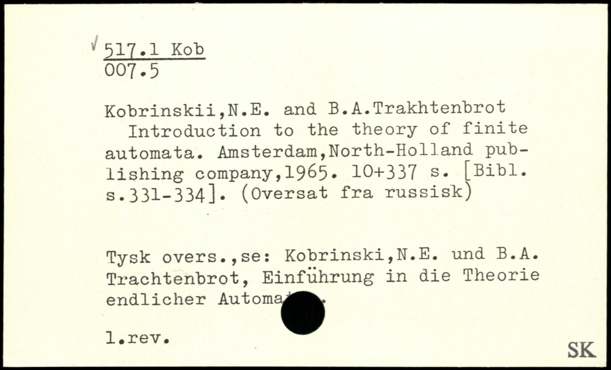 Kobrinskii,N.E. and B.A.Trakhtenbrot Introduction to the theory of finite automata.