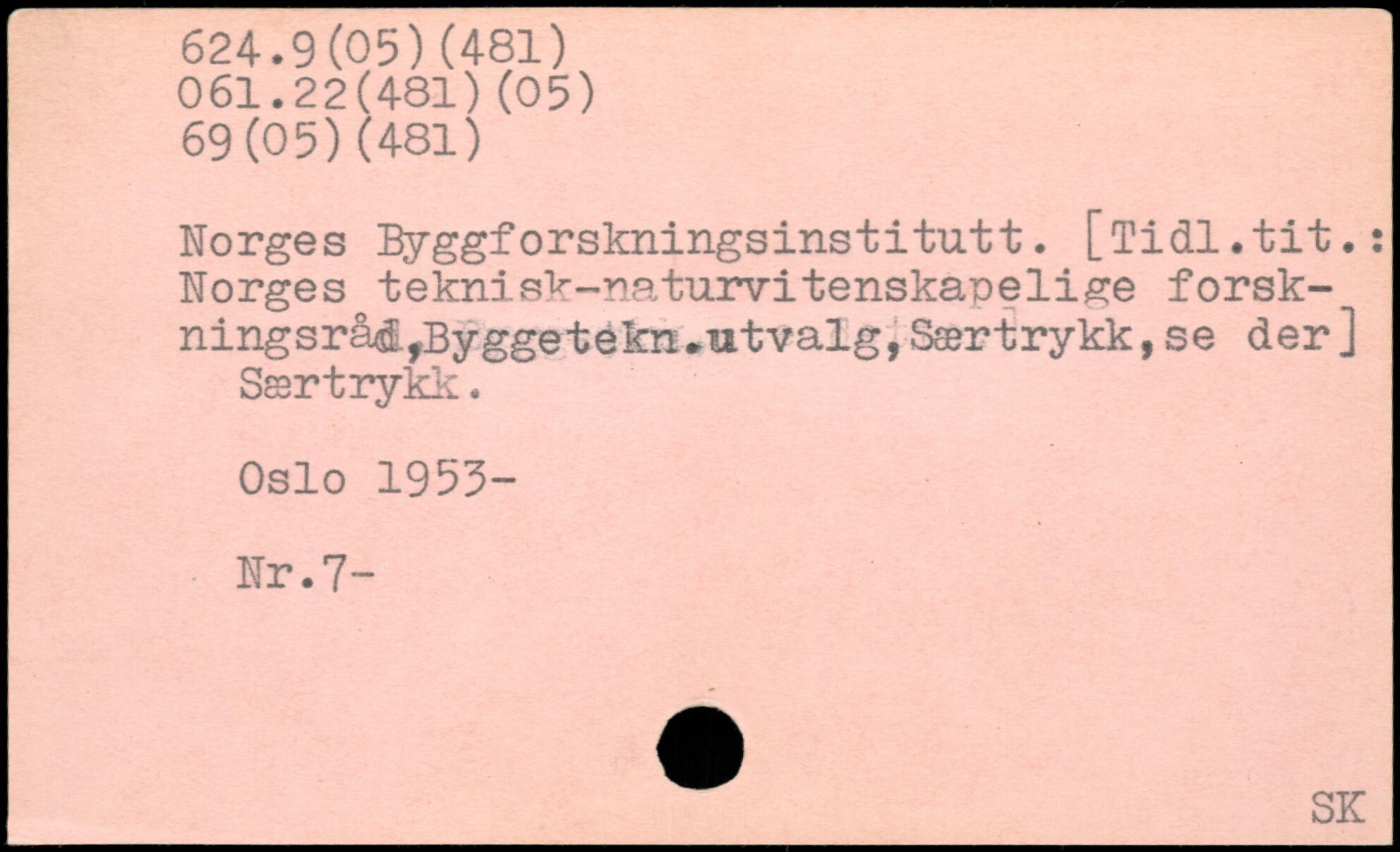 Norges Byggforskningsinstitutt. [Tidl.tit.: Norges teknisk-naturvitenskapelige forsk-^ ningsråéjByggetekn.utvalg, Ssertrykk, se der] Særtrykk. Oslo 1953- Nr.7-