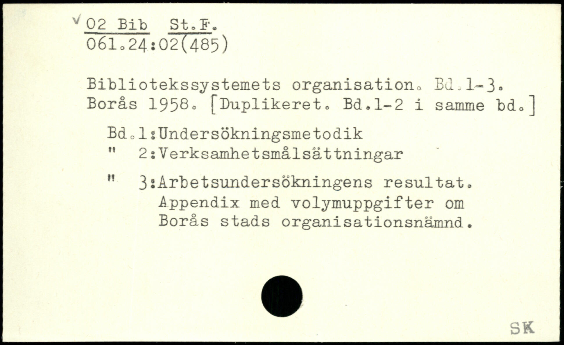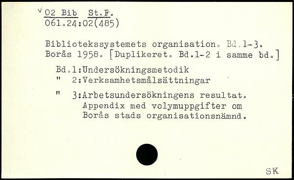 Bibliotekssystemets organisation. Bd,1-3, Borås 1958o [Duplikeret.