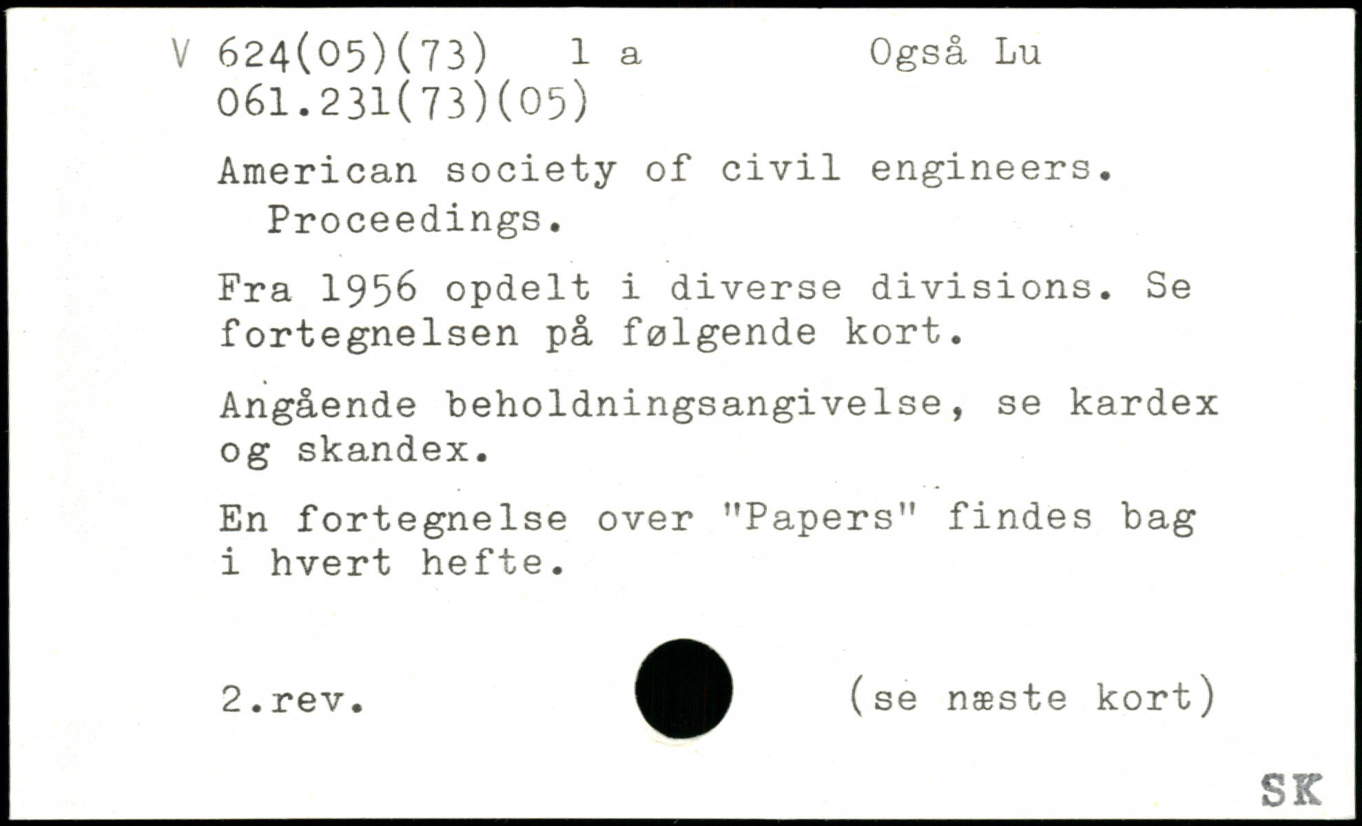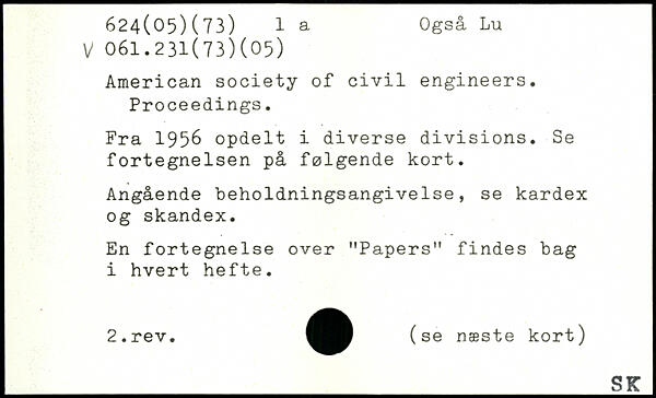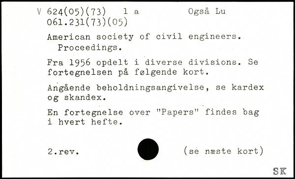 American society of civil engineers. Proceedings. Fra 1956 opdelt i diverse divisions. Se fortegnelsen på følgende kort. Angående beholdningsangivelse, se kardex og skandex. En fortegnelse over ”Papers" findes bag i hvert hefte.