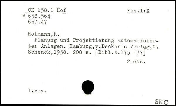 Planung und Projektierung automatisier^, ter Anlagen. Hamburg,v.Decker's Verlag,G. Schenck,1958.