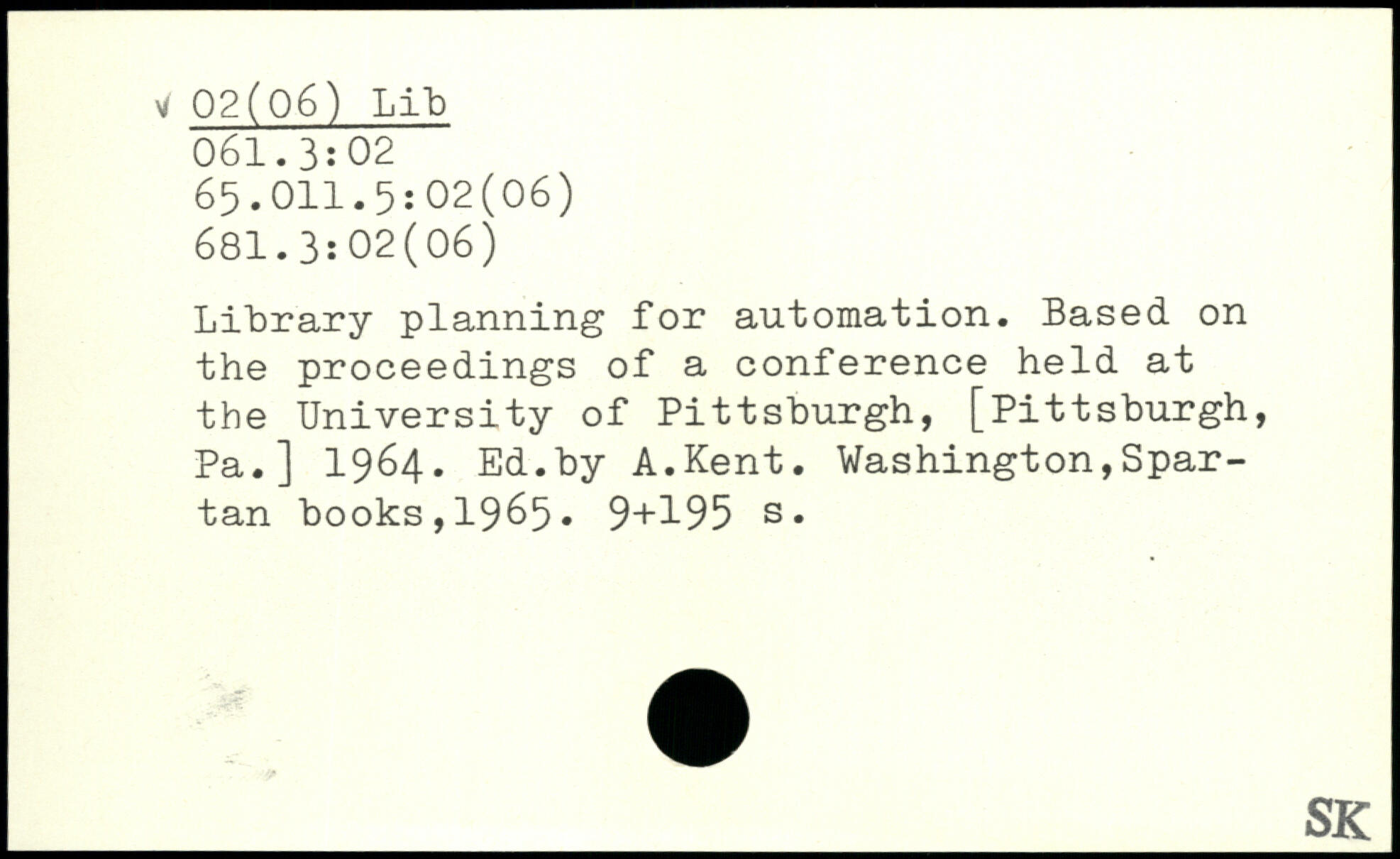 Library planning for automation. Based on the proceedings of a conference held at the University of Pittsburgh, [Pittsburgh, Pa.] 1964. Ed.by A.Kent.