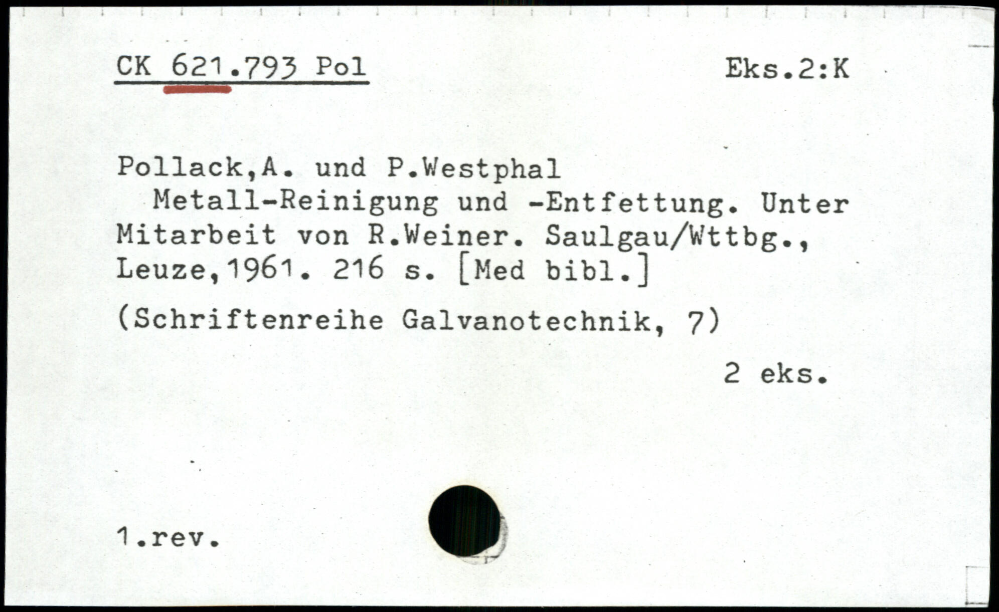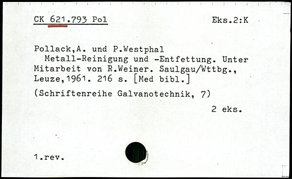 Metall-Reinigung und -Entfettung. Unter Mitarbeit von R.Weiner. Saulgau/Wttbg., Leuze,196'!.