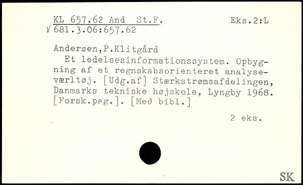 Andersen,P.Klitgård Et ledelsesinformationssystem. Opbygning af et regnskabsorienteret analyse-værltøj. [Udg.af] Stærkstrømsafdelingen, Danmarks tekniske højskole, Lyngby 1968. [Forsk.peg.]. [Med bibl.]