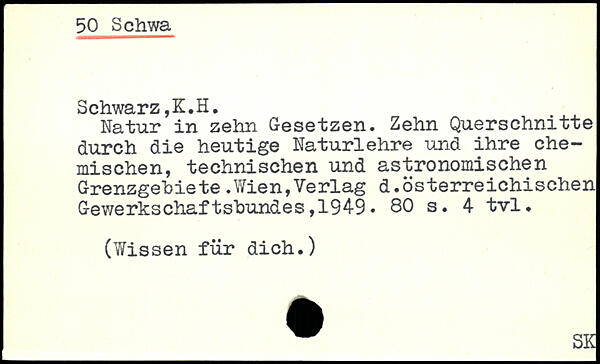 Natur in zehn Gesetzen. Zehn Querschnitte durch die heutige Naturlehre und ihre chemischen, technischen und astronomischen Grenzgebiete.Wien,Verlag d.österreichischen Gewerkschaftsbundes,1949.