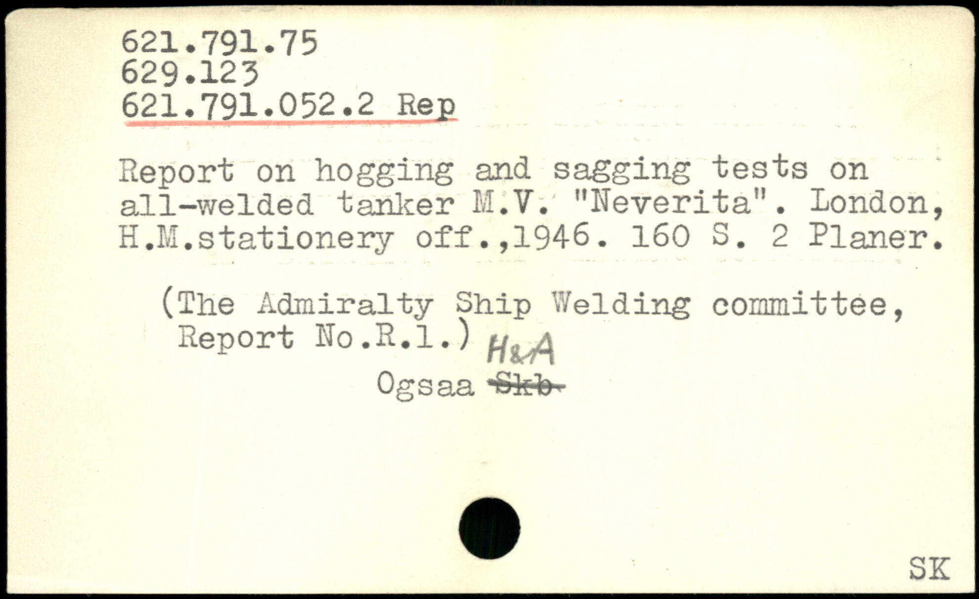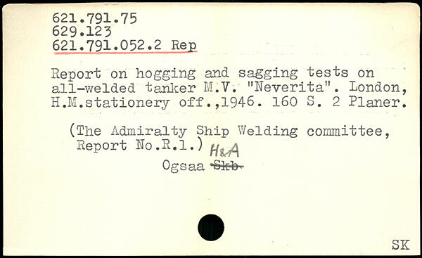Report on hogging and sagging tests on all-welded tanker M.V. "Neverita". London, H.M.stationery off.,1946.