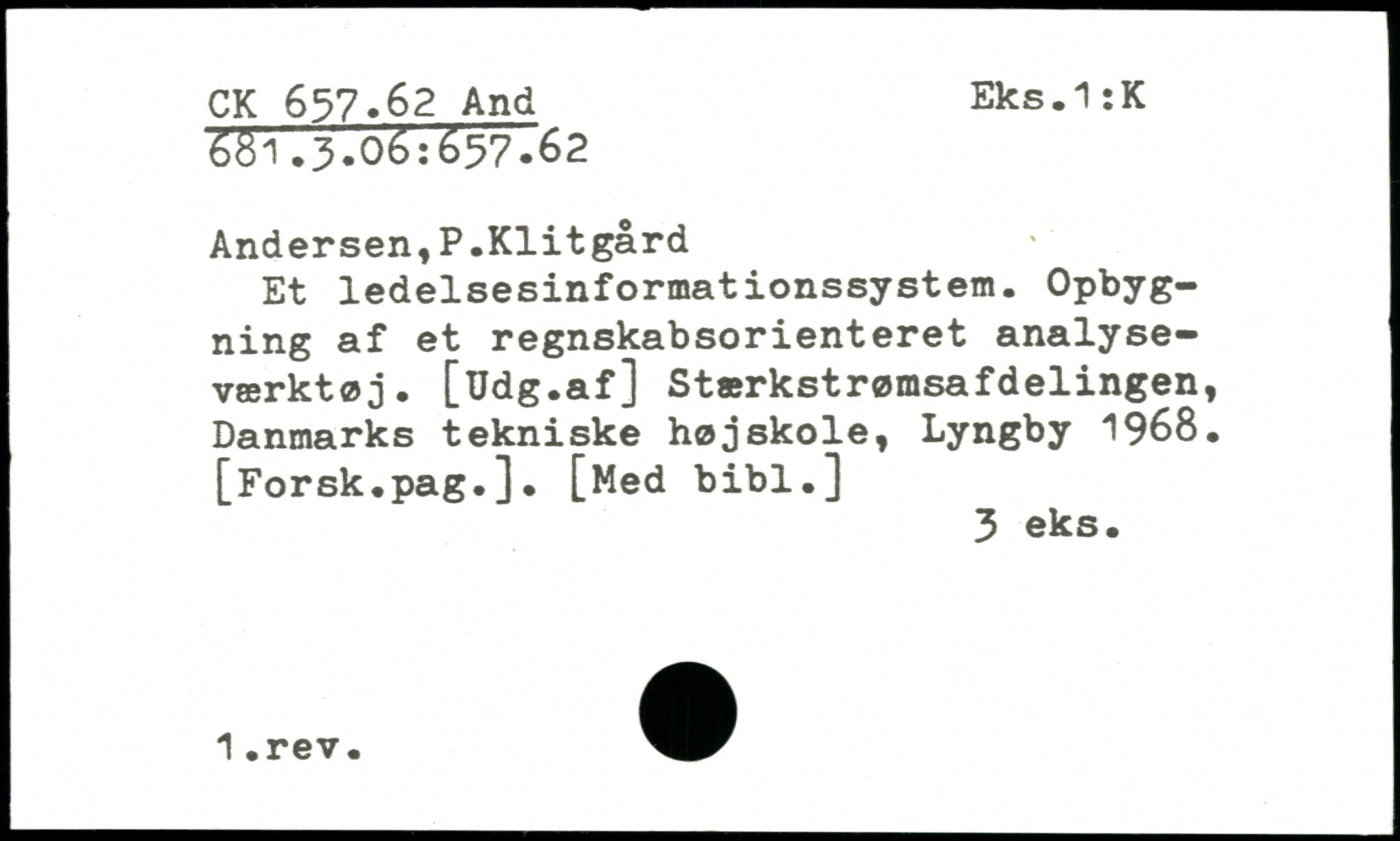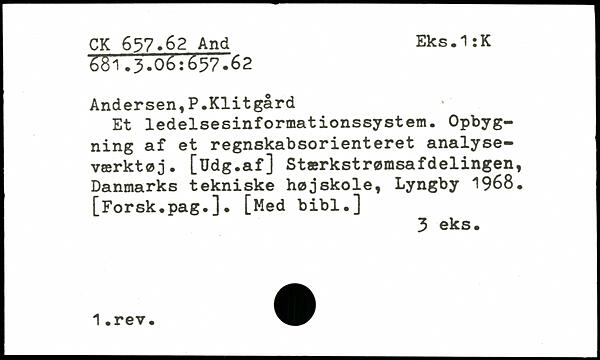 Andersen,P.Klitgård Et ledelsesinformationssystem. Opbygning af et regnskabsorienteret analyseværktøj. [Udg.af] Stærkstrømsafdelingen, Danmarks tekniske højskole, Lyngby 1968. [Forsk.pag.]. [Med bibl.]