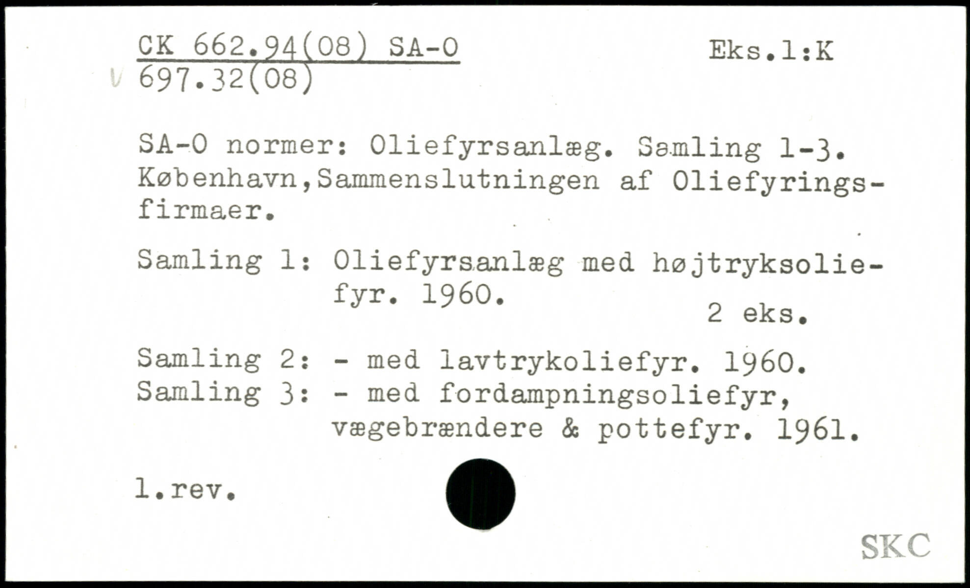 SA-0 normer: Oliefyrsanlæg. Samling 1-3. København,Sammenslutningen af Oliefyrings-firmaer. Samling 1: Oliefyraanlæg med højtryksolie- fyr- 196.- 2 eks. Samling 2: - med iavtrykoliefyr. 1960. Samling 3: - med fordampningsoliefyr, vægebrændere & pottefyr. 1961.
