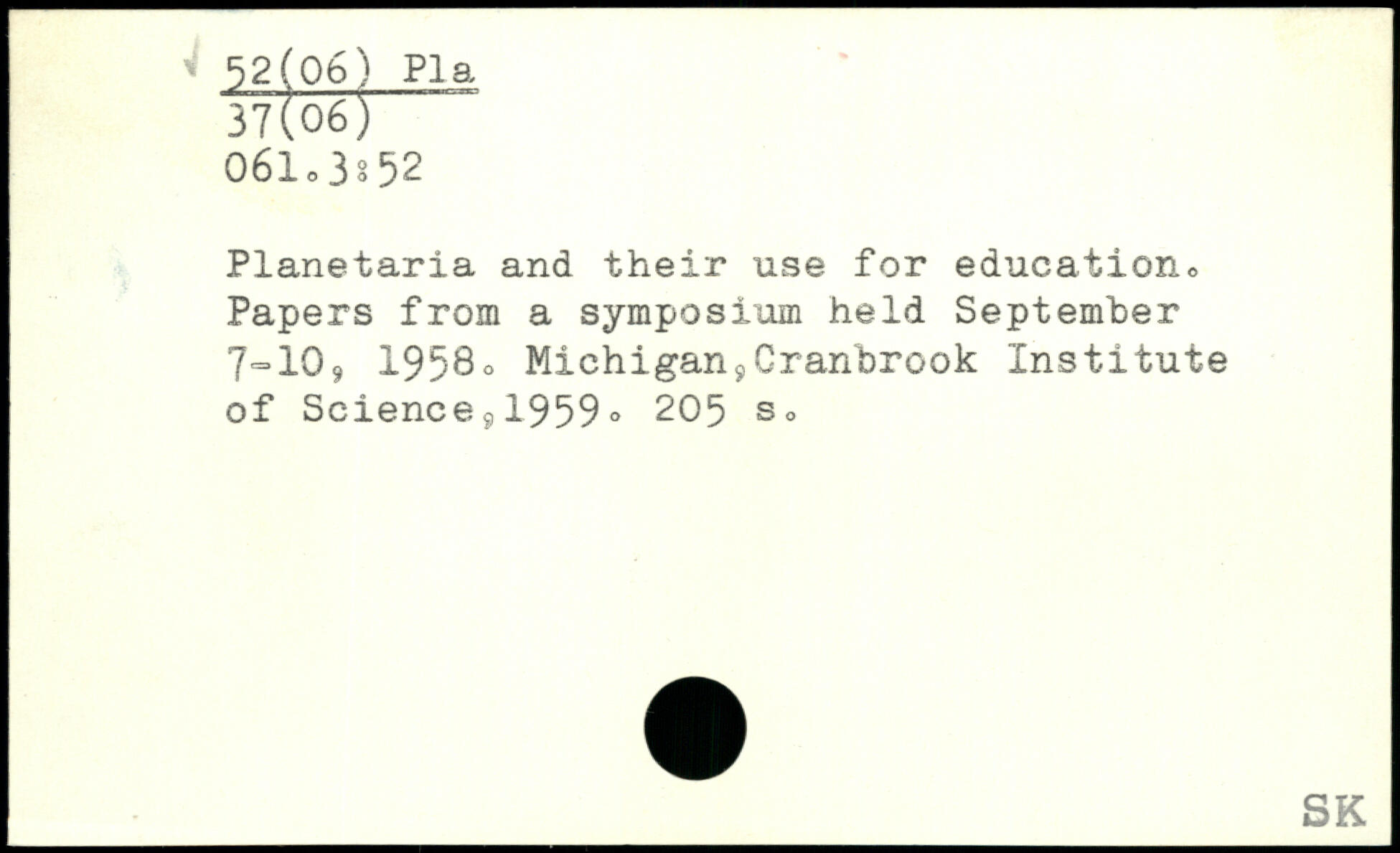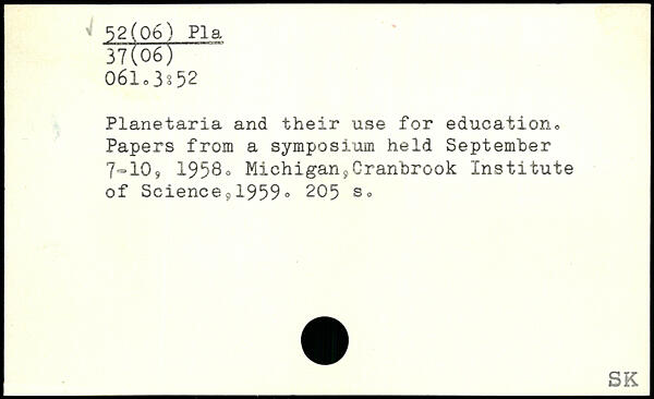 Planetaria and their use for education,, Papers from a symposium held September 7=109 1958o