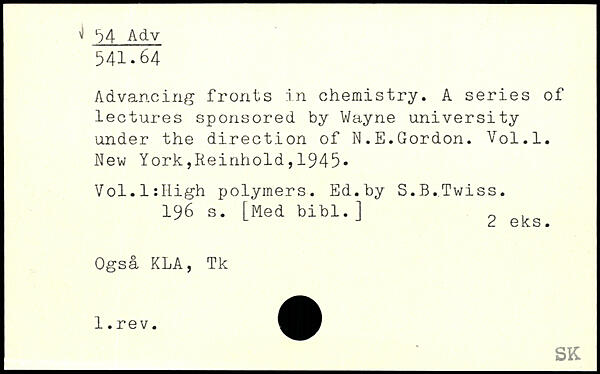 Advancing fronts in chemistry. A series of lectures sponsored by Wayne university under the direction of N.E.Gordon.