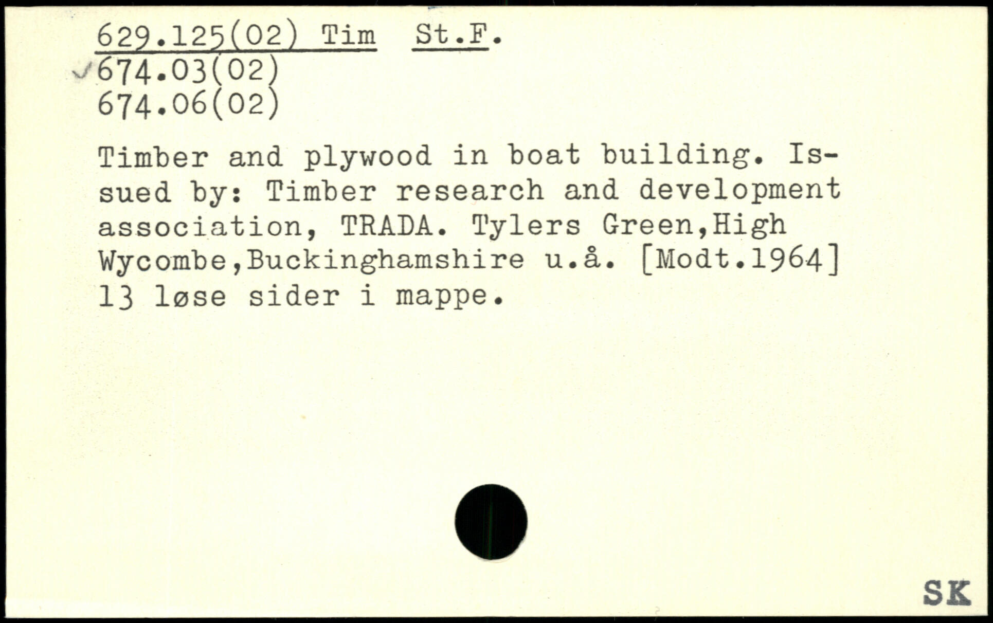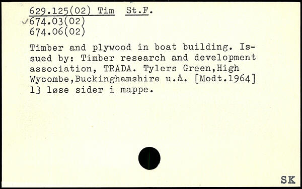 Timber and plywood in boat building. Issued by: Timber research and development association, TRADA. Tylers Green,High Wycombe,Buckinghamshire u.a. [Modt.1964] 13 lose sider i mappe.