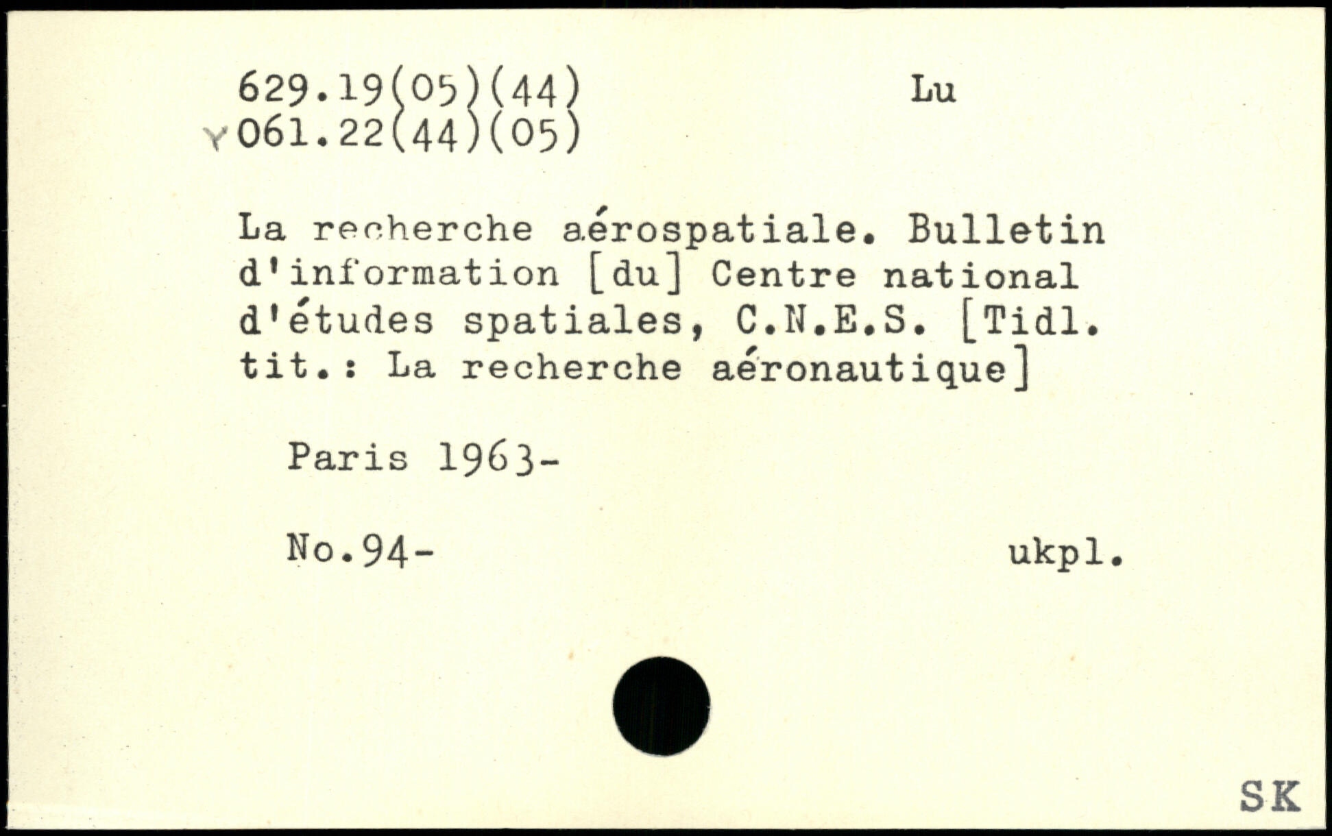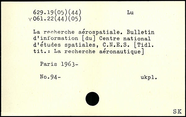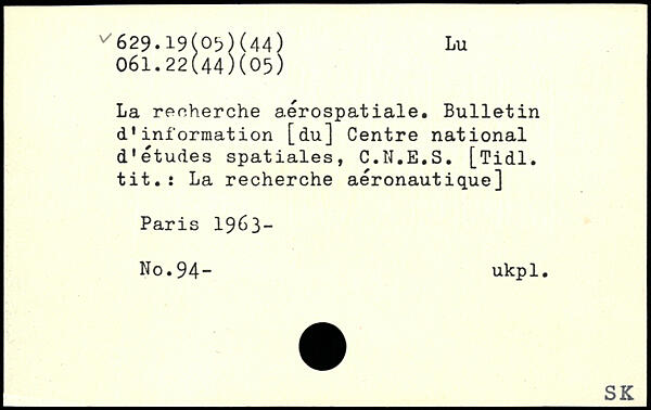 La recherche aérospatiale. Bulletin d'information [du] Centre national d'études spatiales, C.N.E.S. [Tidl. tit.: La recherche aéronautique]