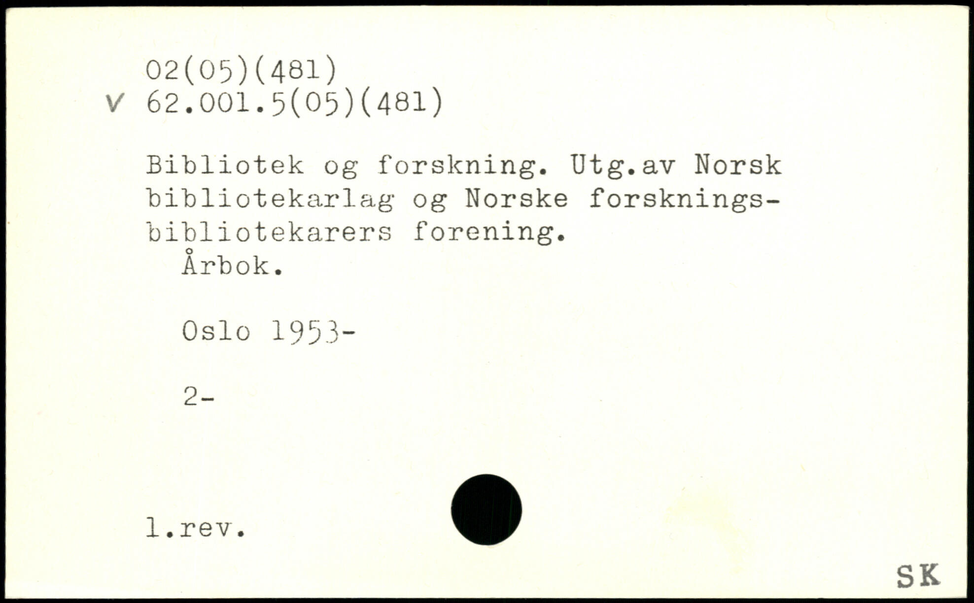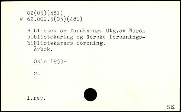 Bibliotek og forskning. Utg.av Norsk bibliotekarlag og Norske forskningsbibliotekarers forening. Årbok. Oslo 1953- 2-