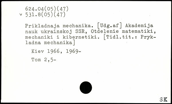 Prikladnaja mechanika. [Udg.af] Akademi ja nauk ukrainskoj SSR, Otdelenie matematiki, mechaniki i kibernetiki. [l'idl.tit.î Pryk-ladna mechanika] Kiev 19é6, 1969- Tom 2,5-