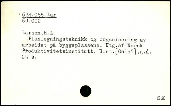 PIanlegnings teknikk og organisering av arbeidet på byggeplassene. Utg.af Norsk ^toduktivitetsinstitutt. TJ0st.[Oslo?],u.å.