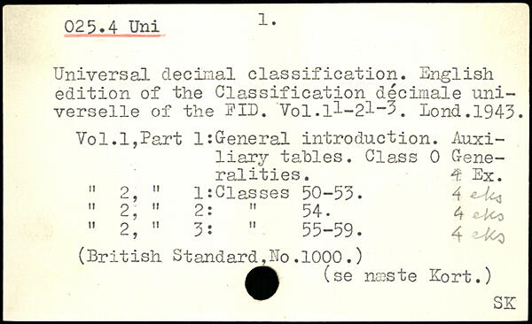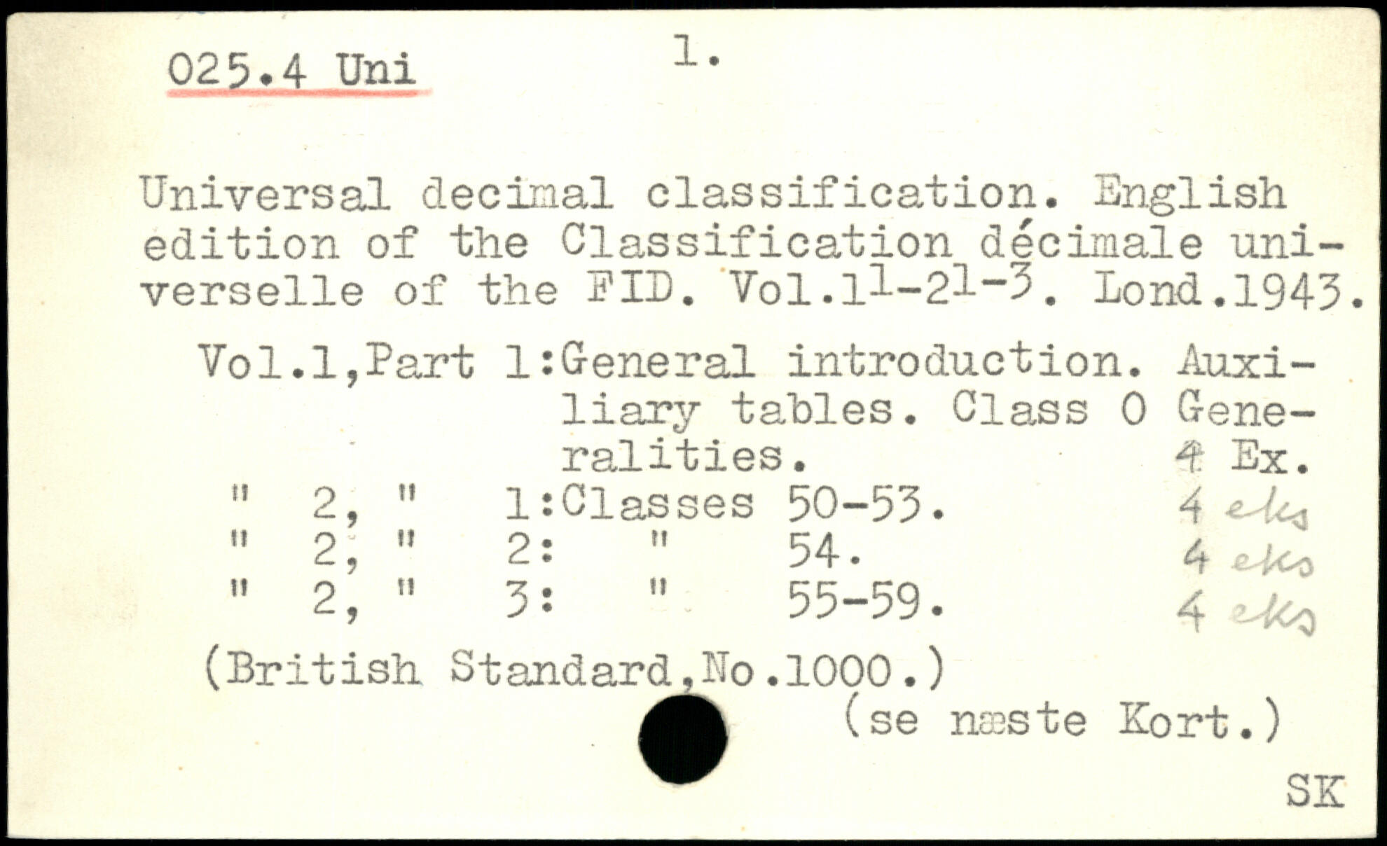 Universal decimal classification. English edition of the Classification decimale universelle of the FID. Tol.ll-2l"5. Lond.1943. Vo1.1,Part 1:General introduction. Auxiliary tables. Class 0 Generalities. Ex. " 2, " l:Classes 50-53. 4 Ut. " 2, " 2: " 54. 4^co