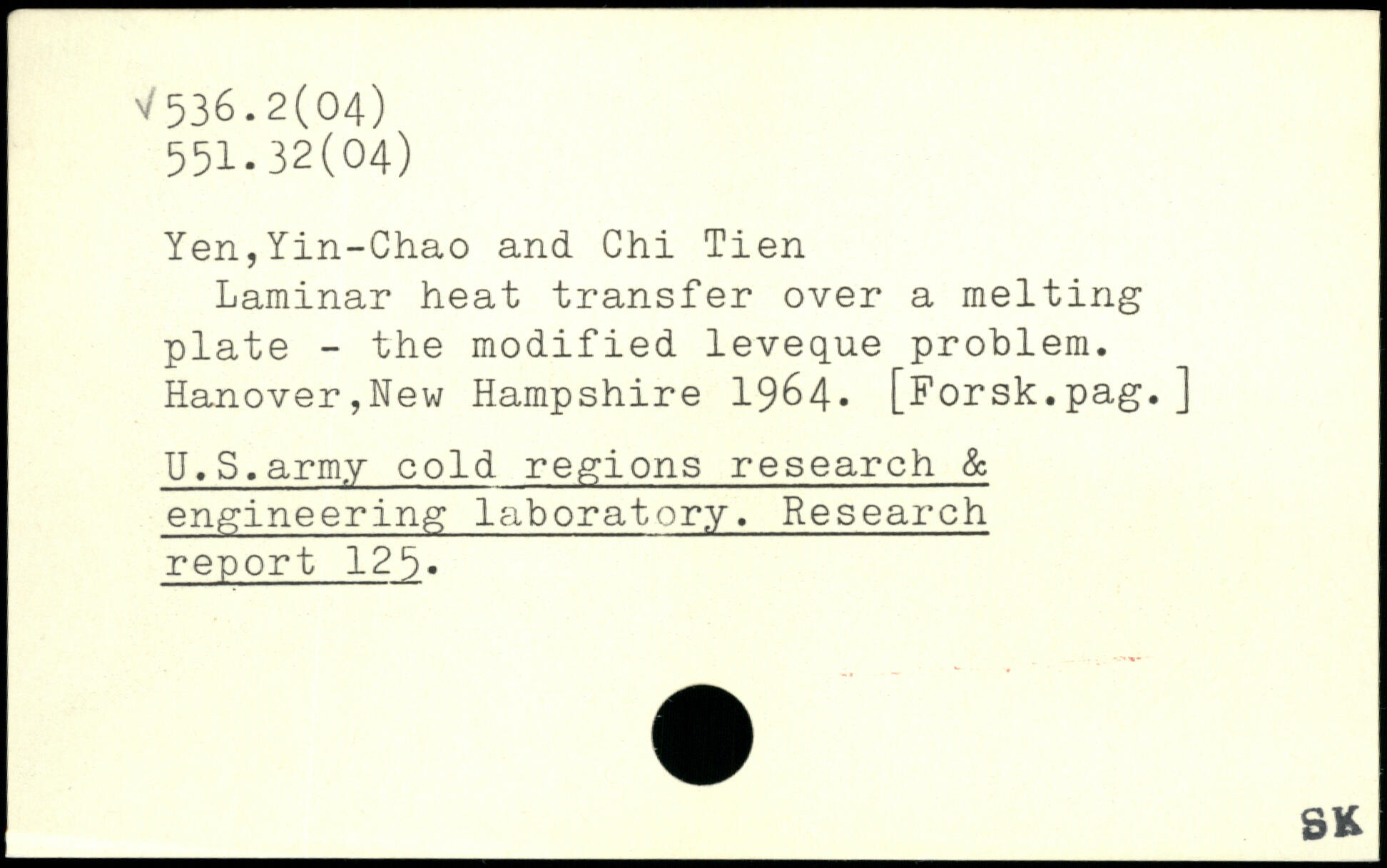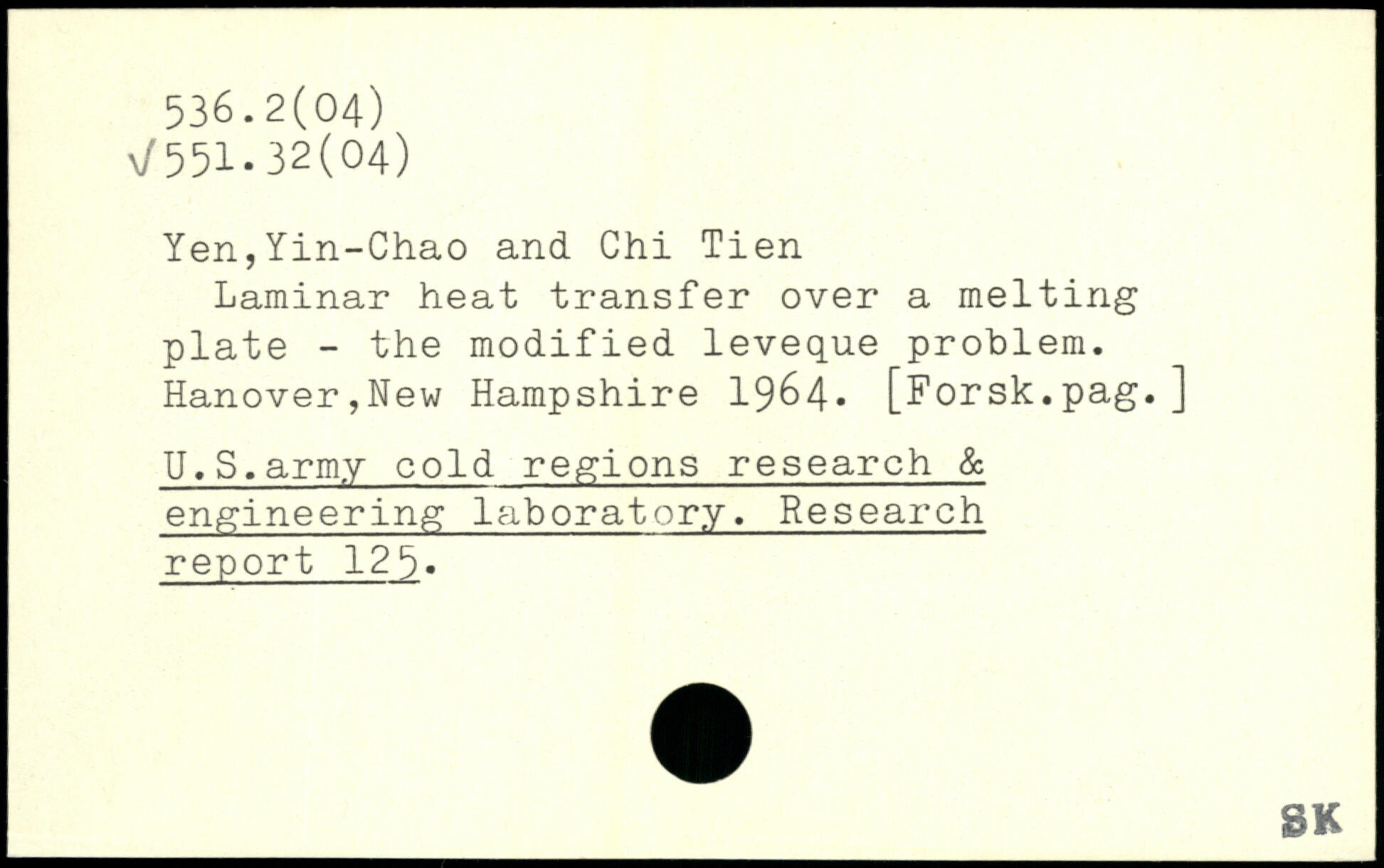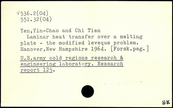 Yen,Yin-Chao and Chi Tien Laminar heat transfer over a melting plate - the modified leveque problem. Hanover,New Hampshire 1964. [Forsk.pag.] U.S.army cold regions research & engineering laboratory. Research report 129