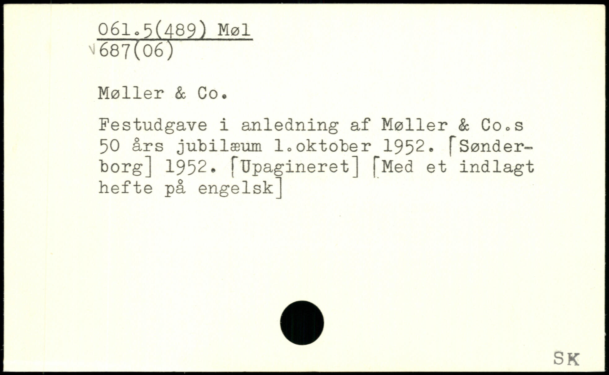 Festndgave i anledning af Møller & Co.s 50 års jubilæum 1. oktober 1952. [Sønderborg] 1952. [Upagineret] [Med et indlagt hefte på engelsk]