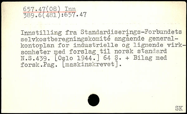 Innst1111ng fra Standardiserings-Forbundets selvkostberegningskomité angående generalkontoplan for industrielle og lignende virk-somheter med forslag til norsk standard N.S.439. [Oslo 1944.]