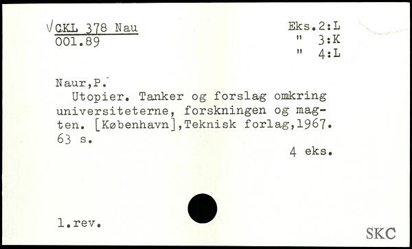 Utopier. Tanker og forslag omkring universiteterne, forskningen og magten. [København],Teknisk forlag,19^7